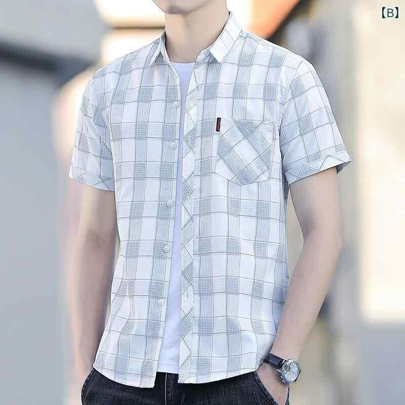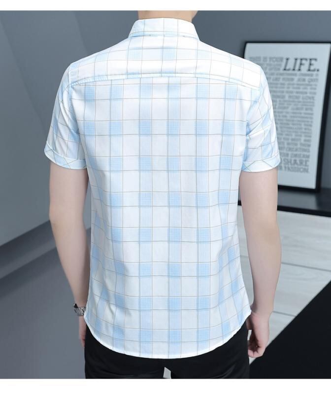 シャツ メンズ 半袖 チェック柄 きれいめカジュアル 韓国風 スタイリッシュ 高級感 清涼感 夏 通気性 吸湿速乾 防シワ アイロン不要 綿ポリエステル混紡 スリムフィット