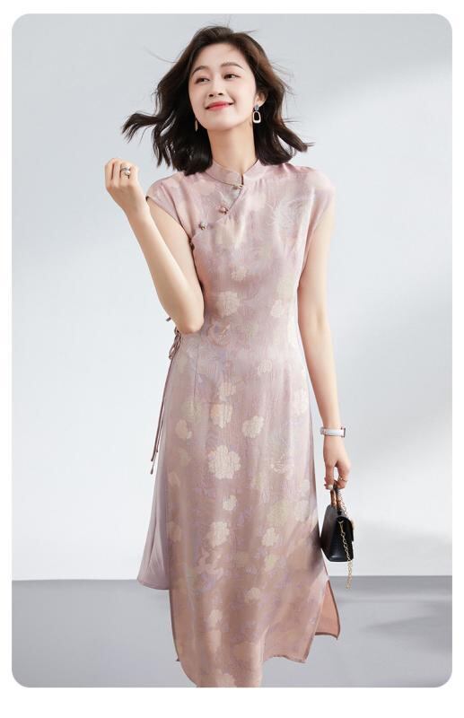 ワンピース レディース 新チャイナ風 改良チャイナドレス キャミソールワンピース 桑蚕シルク 花柄プリント ロング丈 Aライン ノースリーブ ハイウエスト スタンドカラー 高級感 エレガント レトロ ピンク 2点セット カーディガンセット
