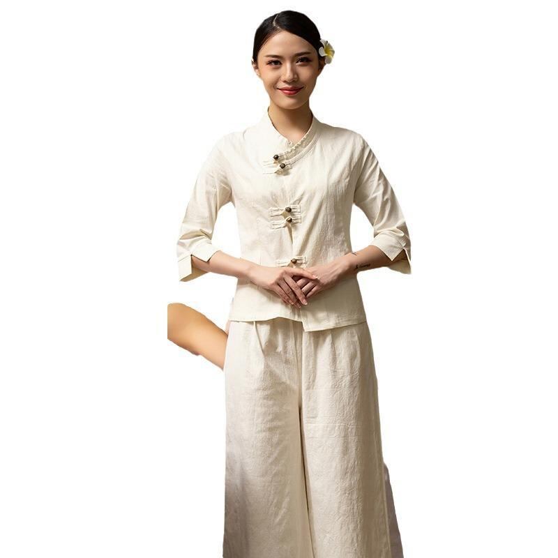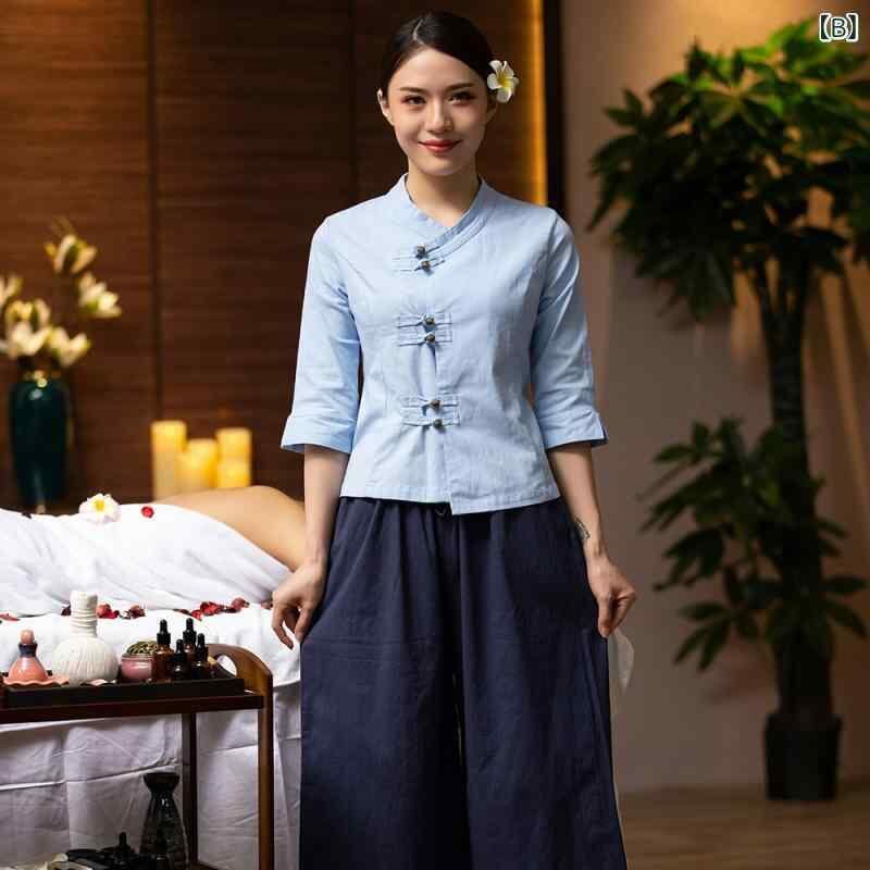 エステ ワークウェア レディース 美容師 ユニフォーム 上下セット 吸湿速乾 サロン制服 施術着 綿麻混紡 七分袖 スタンドカラー ミドル丈 トップス ロングパンツ ベージュ ライトブルー ピンク 女性用 整体 療術 介護