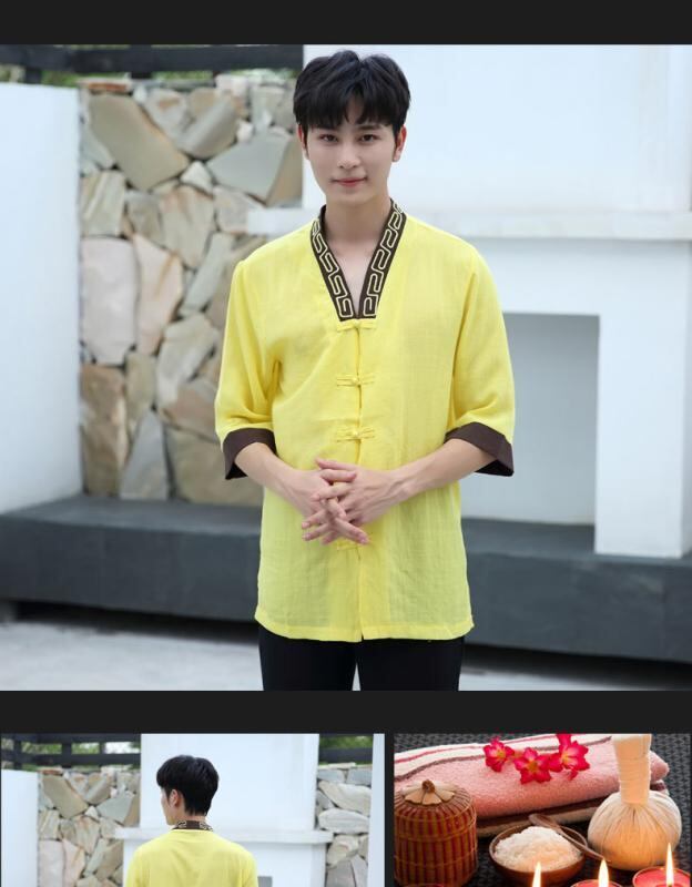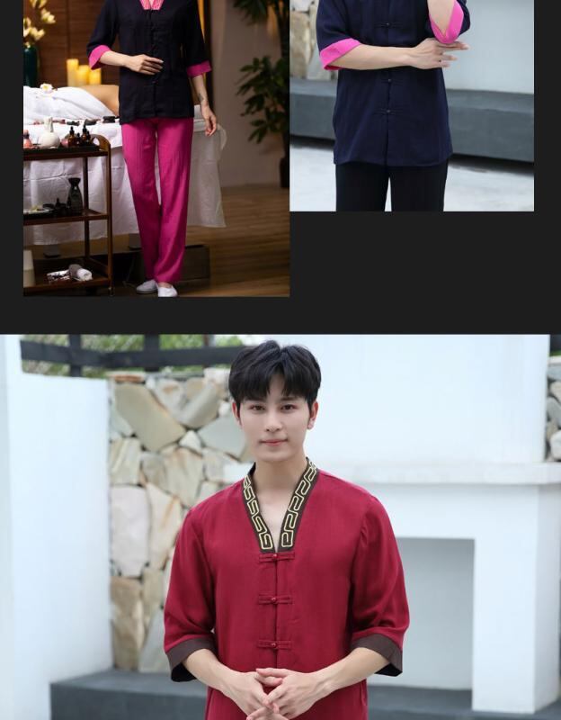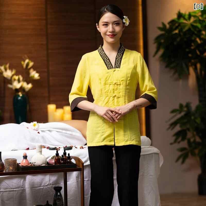 制服 レディース 美容サロン エステ 足湯 フットケア 施術着 コットン リネン ブレンド パンツスーツ セットアップ 吸湿速乾 通気性 立襟 七分袖 上品 春 夏 秋 快適 ワークウェア 上下セット リラクゼーション マッサージ スパ