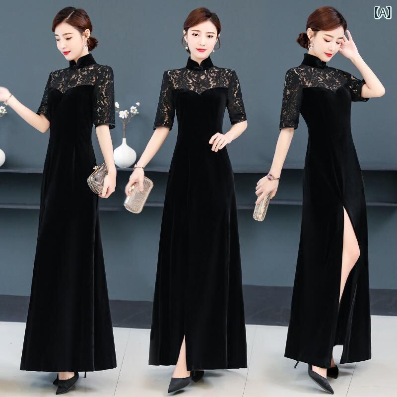 ワンピース レディース 改良版 チャイナドレス レトロ中華風 ロング丈 ベロア ポリエステル 無地 ブラック 大きいサイズ ゆったりサイズ Aライン スタンドカラー 五分袖 ハイウエスト 細見え 着痩せ効果