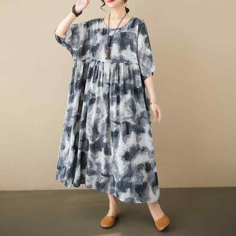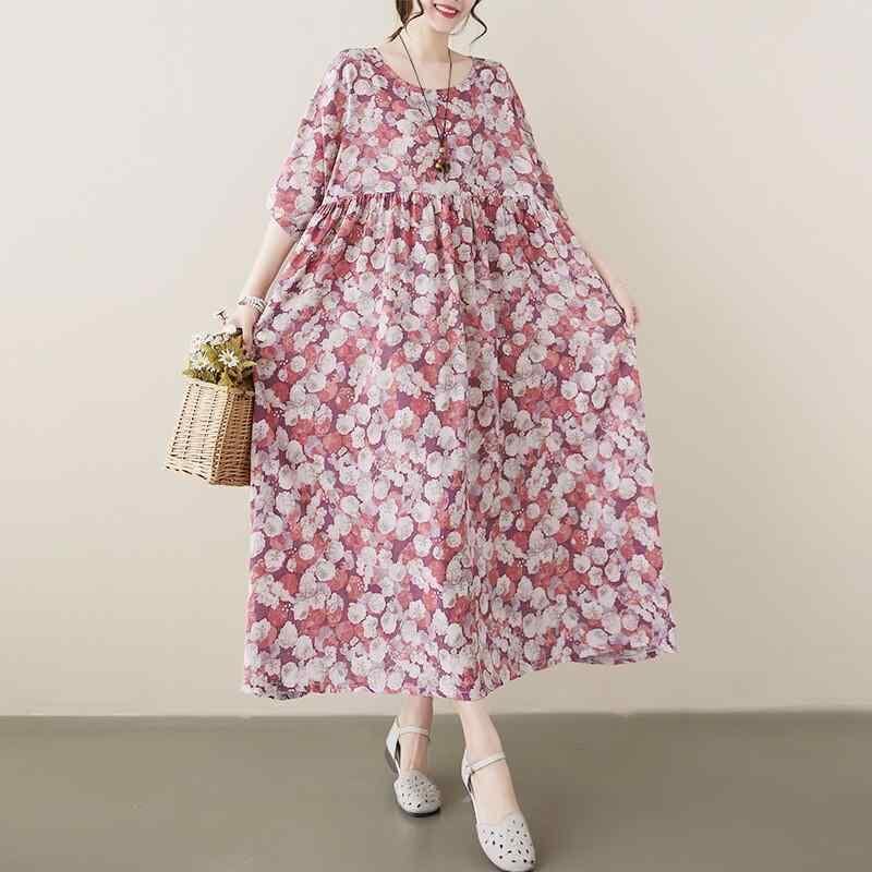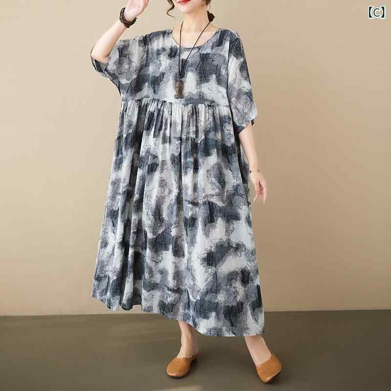 ワンピース 大きいサイズ レディース 女性用 ぽっちゃりさん 中国風 花柄 プリント レトロ エスニック 綿 コットン ポリエステル ロング丈 超大Aライン フレアスカート 五分袖 ハーフスリーブ ラウンドネック 丸首 カジュアル 普段使い