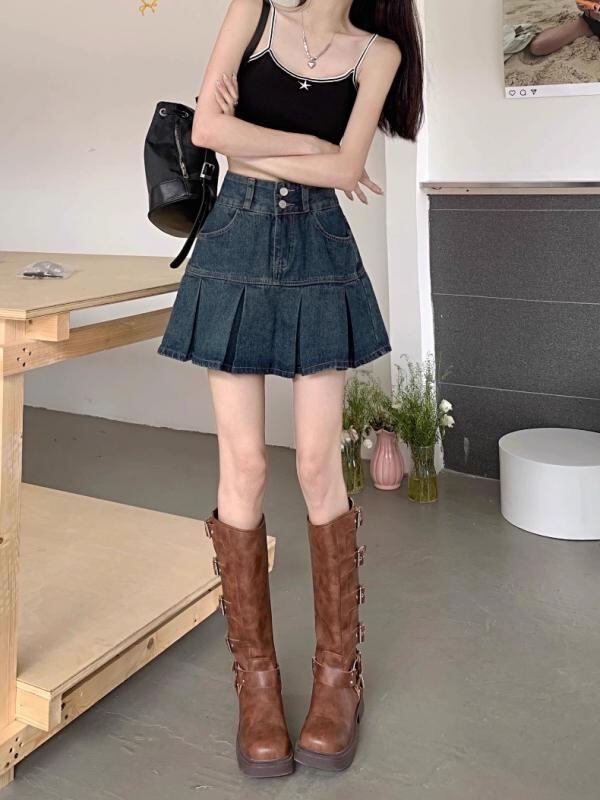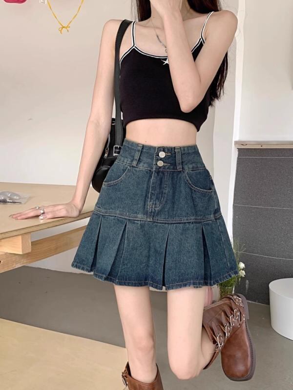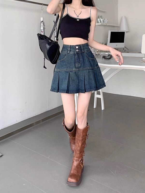 スカート レディース 大きいサイズ プラスサイズ 夏 体型カバー 着痩せ お腹カバー スタイルアップ ハイウエスト プリーツ デニム Aライン ミニスカート デザイン 無地 コットン 通勤 カジュアル オフィス