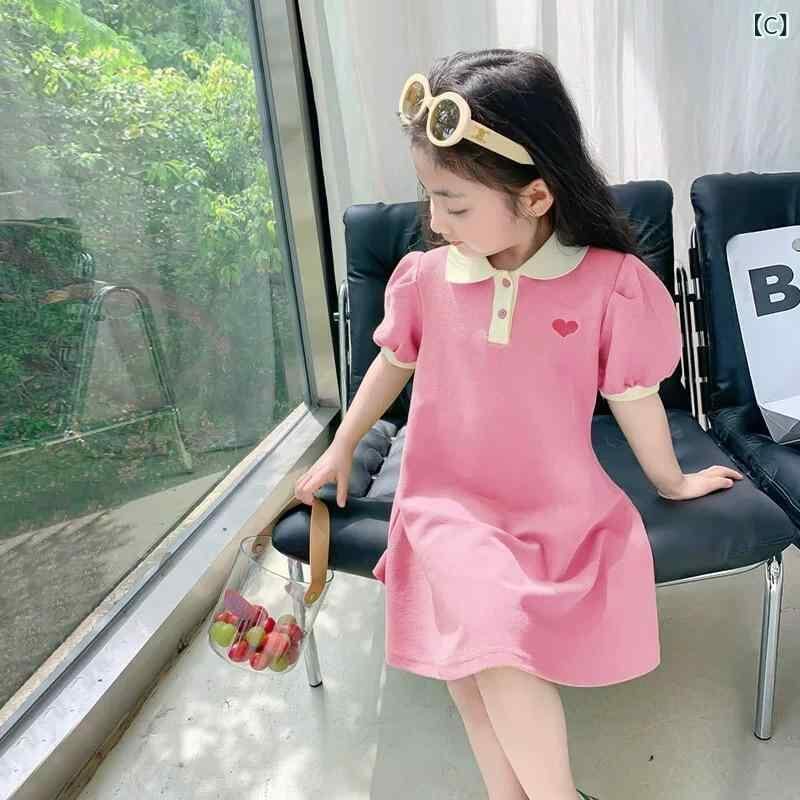 ワンピース キッズ 女の子 ポロ襟 プリンセス風 夏服 半袖 Aライン 子供服 無地 シンプル ポリエステル素材 涼しい 快適 カジュアル お出かけ 通園着 キュート かわいい グリーン パープル ピンク