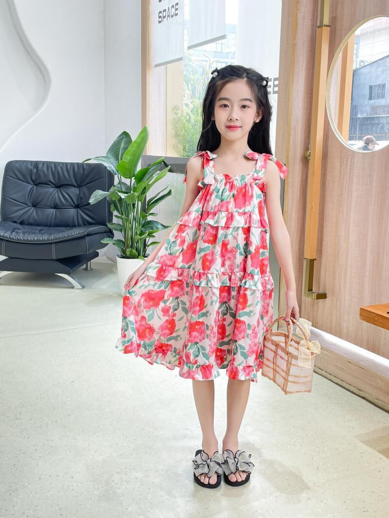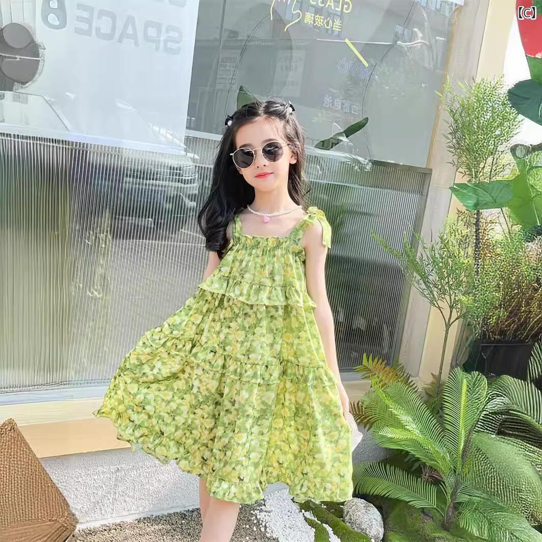 ワンピース キッズ 女の子 子供 ガールズ 夏 サマー ビーチ リゾート 海水浴 プール お出かけ 普段使い 花柄 小花柄 プリント 総柄 キャミソール ノースリーブドレス ポリエステル サテン調 光沢感 レッド ピンク グリーン