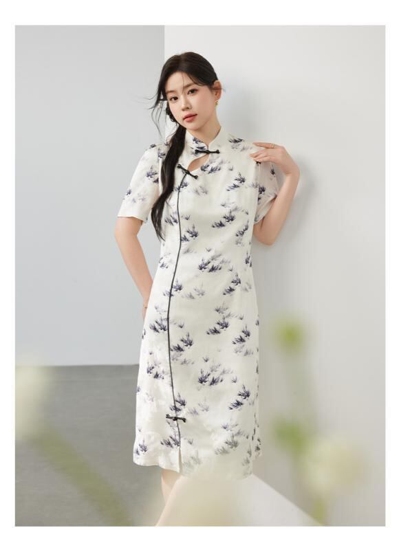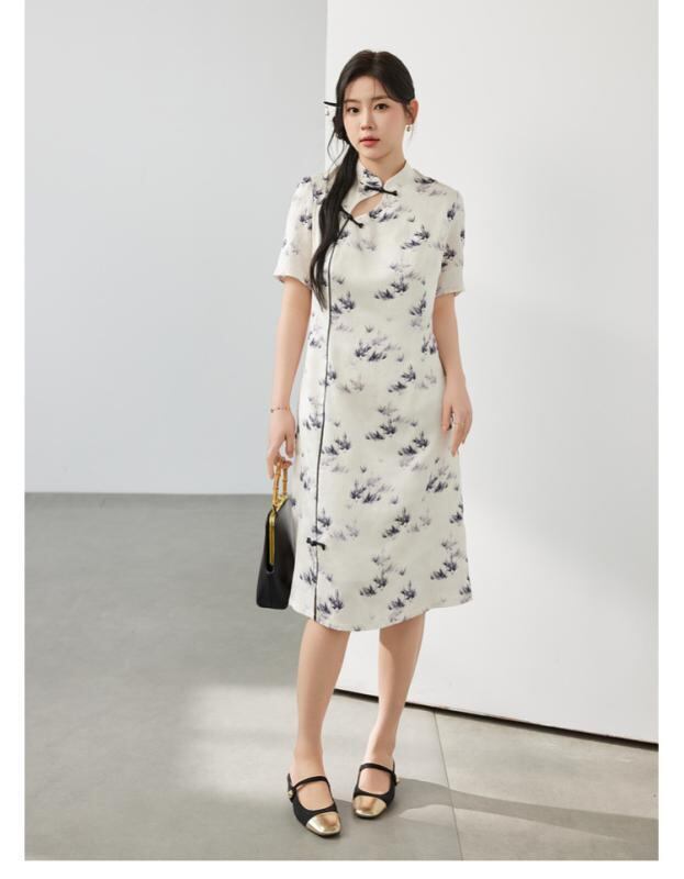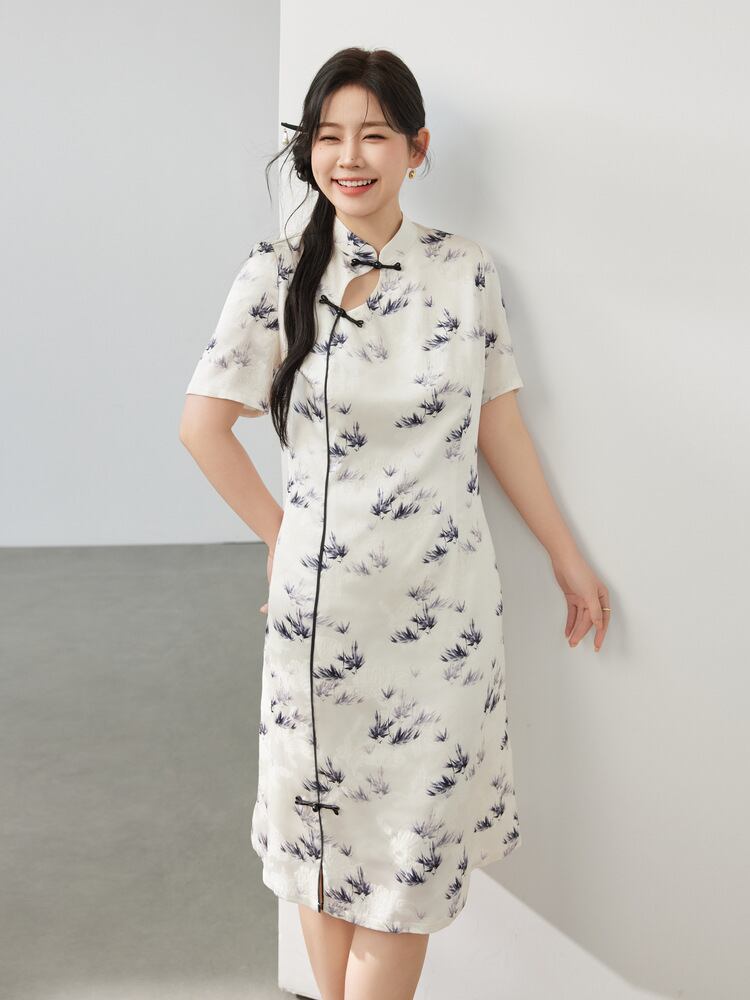 ワンピース レディース 大きいサイズ 新チャイナ風 改良 チャイナドレス ジャガード織り 花柄 スタンドカラー Aライン 五分袖 ミモレ丈 エレガント 細見え 体型カバー ポリエステル製 レトロモダン アプリコットカラー
