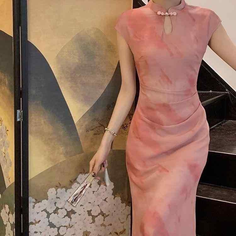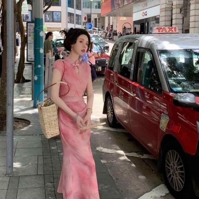 ワンピース レディース 新中華風 改良 チャイナドレス レース チャイナボタン 半袖 ハイウエスト レトロ クラシック ロング丈 ポリエステル ストレッチ ピンク 大きいサイズ パーティー フォーマル 幾何学模様