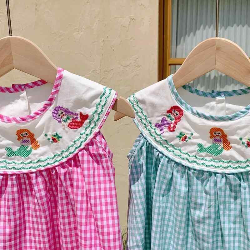 キッズ 女の子 ワンピース マーメイド 刺繍 チェック柄 ノースリーブ コットン Aライン やわらか素材 おしゃれ かわいい 夏服 普段使い 子供服