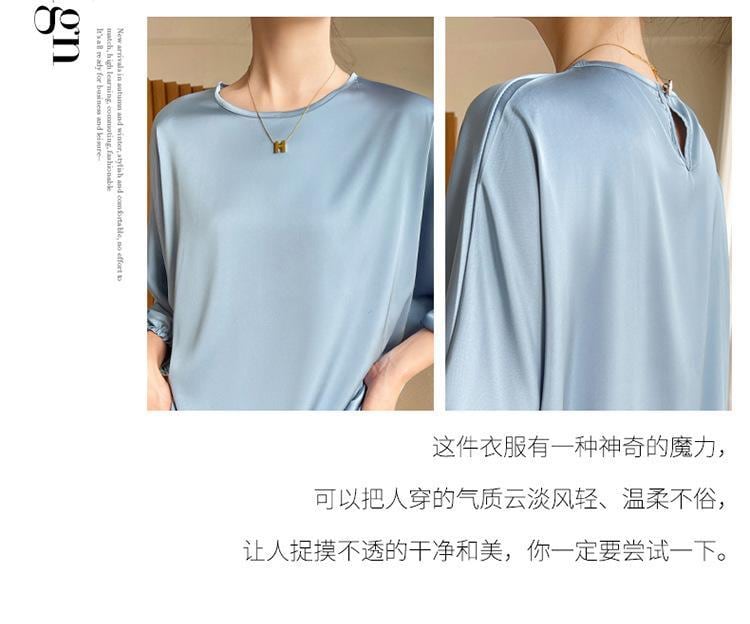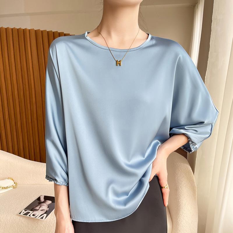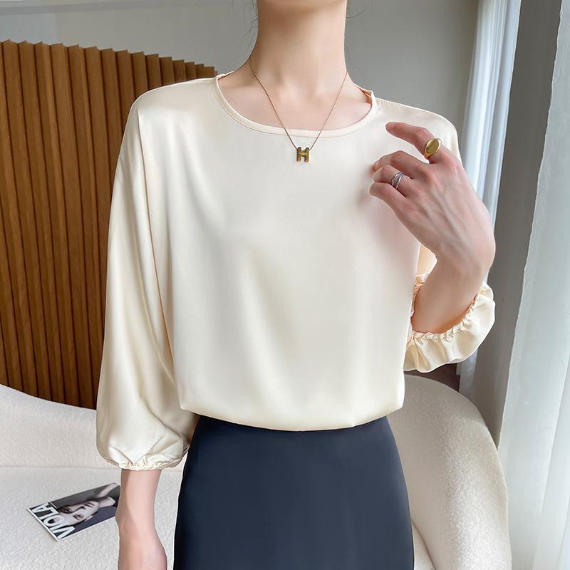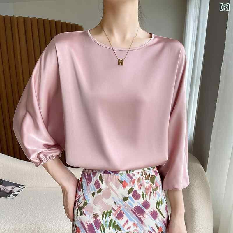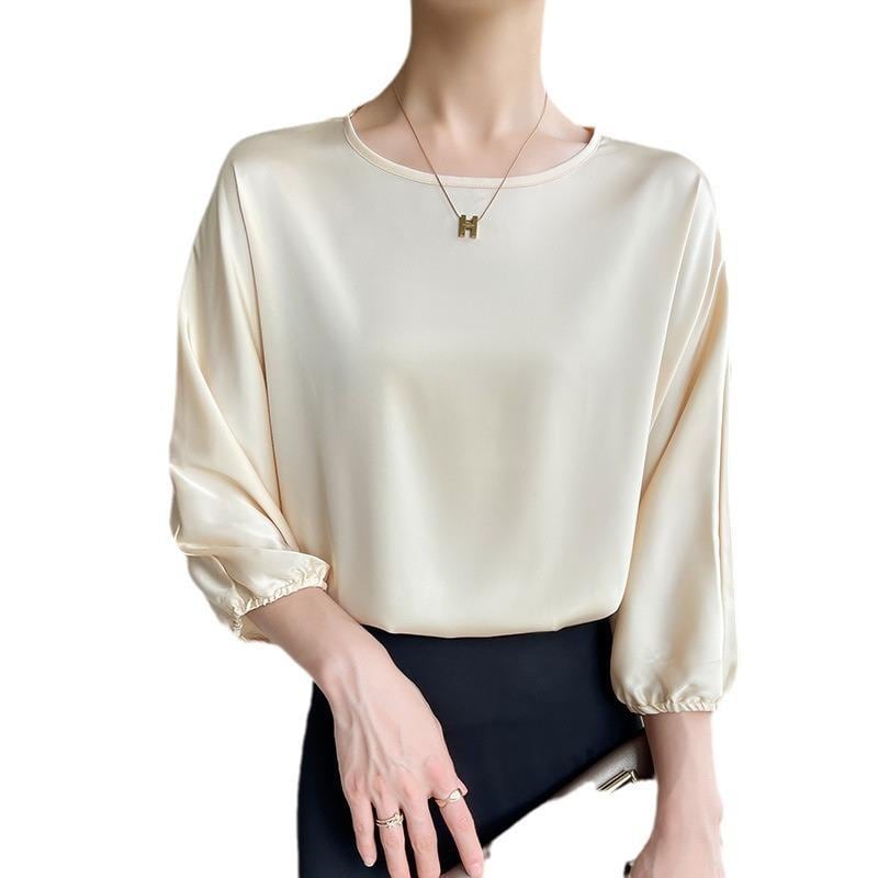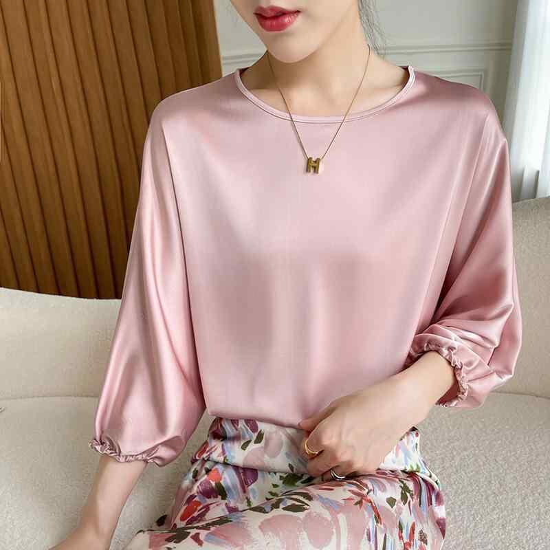 ブラウス レディース クルーネック ランタンスリーブ 五分袖 サテン調 アセテート ゆったり 細見え 着回し力抜群 通勤 きれいめ 淡黄色 豆緑 黒 カーキ 霧ブルー 桜ピンク | cybercart