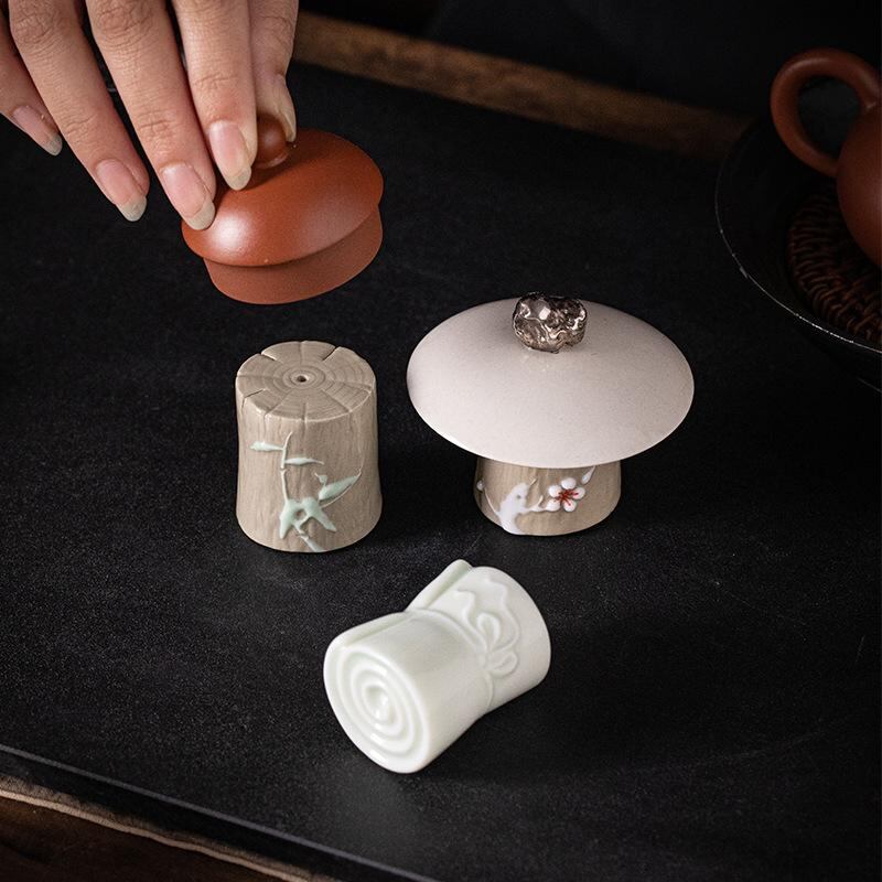 蓋置き 陶器製 切り株デザイン 和モダン 工夫茶器 茶道具 急須 蓋碗 蓋支え ティーアクセサリー 茶卓 飾り 置物