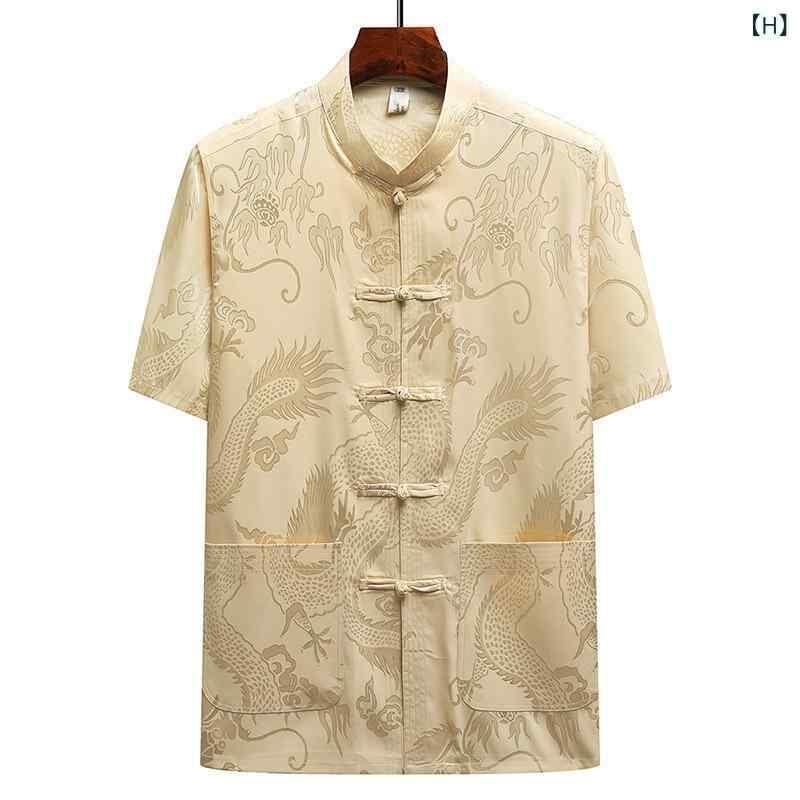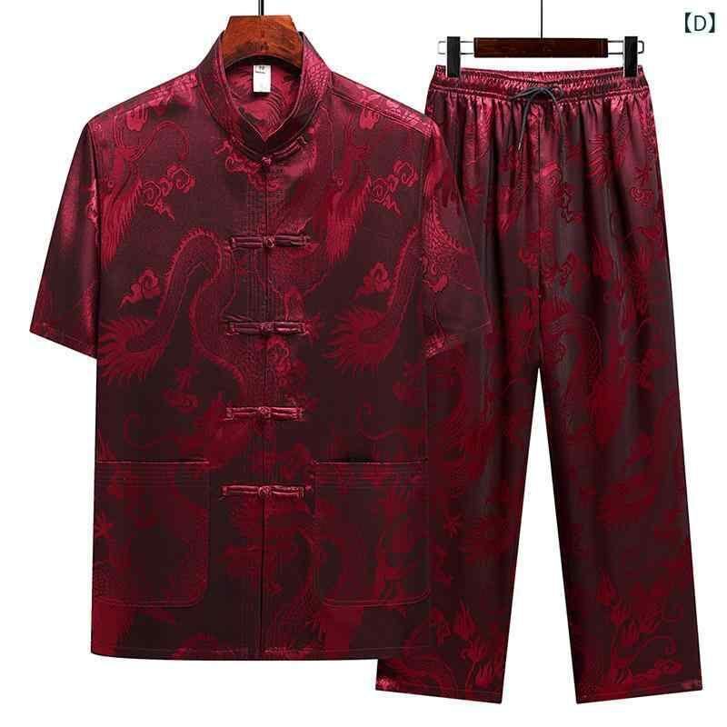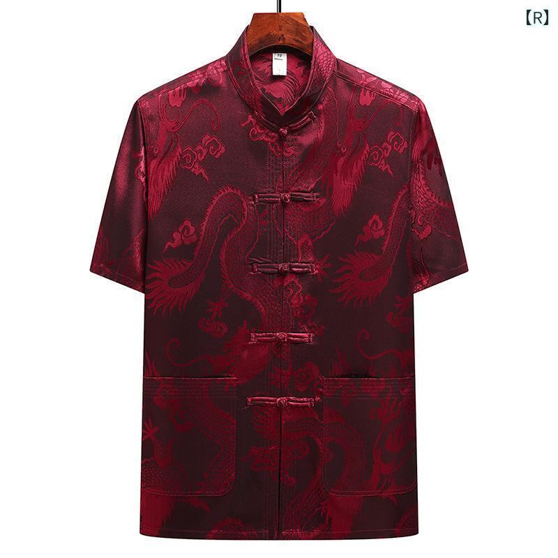 太極拳服 メンズ 中高年向け 半袖 上下セット 唐装 中国風 龍柄 ジャカード織り 刺繍 武術 カンフー 練習着 演舞服 普段使い 夏用 涼しい 通気性 快適