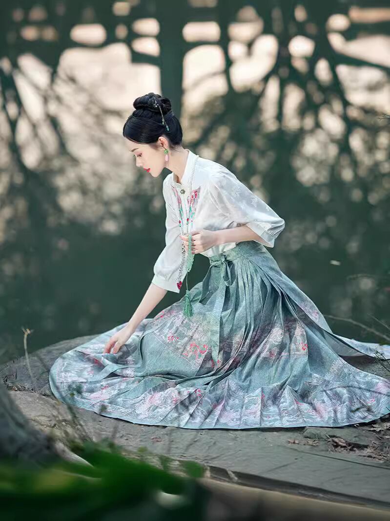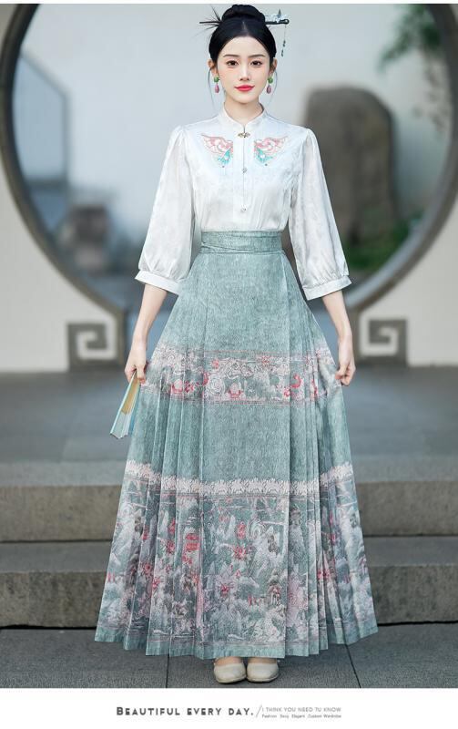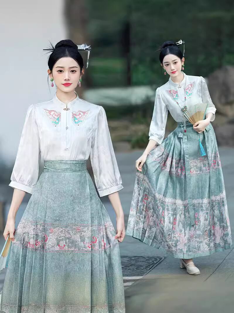 セットアップ レディース ネオチャイニーズスタイル チャイニーズ風 漢服テイスト 花柄プリント 刺繍 ジャカード織り フレア 馬面スカート ブラウス ポリエステル 高級感 普段使い お洒落着 2点セット ホワイト ライトブルー