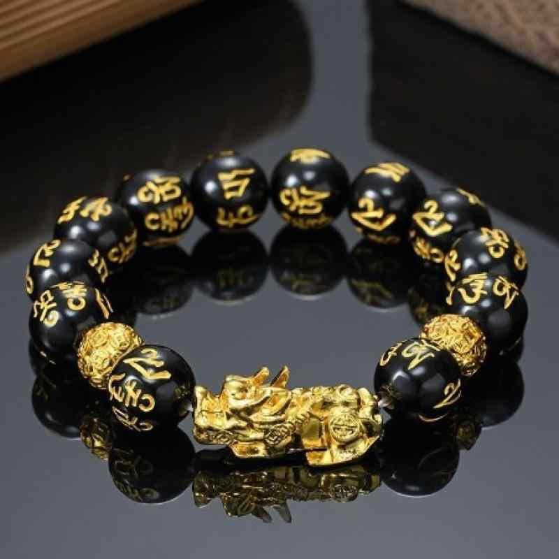 ブレスレット ペア カップル用 貔貅 六字真言 天然石風オブシディアン ゴールドメッキ カラフル 金銭珠 パワーストーン 開運 風水 お守り 男女兼用 合金製
