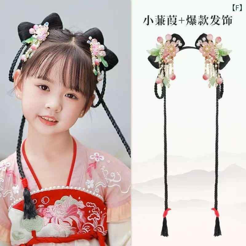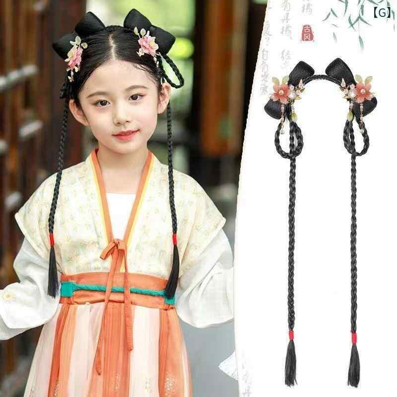 ヘアアクセサリー キッズ 漢服 中華風 古典的 一体型 簡単装着 つけ毛 三つ編み かんざし 髪飾り お団子ヘア アップスタイル まとめ髪 リボン 発表会 イベント コスプレ