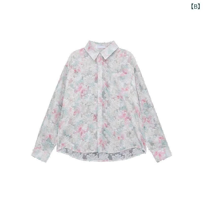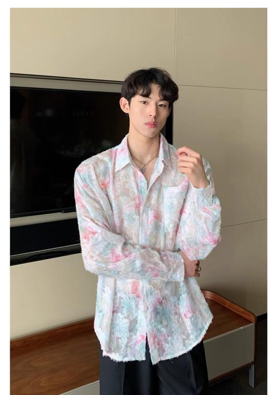シャツ メンズ 長袖 オープンカラー 薄手 ポリエステル シアー UVカット ゆったり オーバーサイズ 韓国風 小花柄 個性的なデザイン カジュアル 普段使い