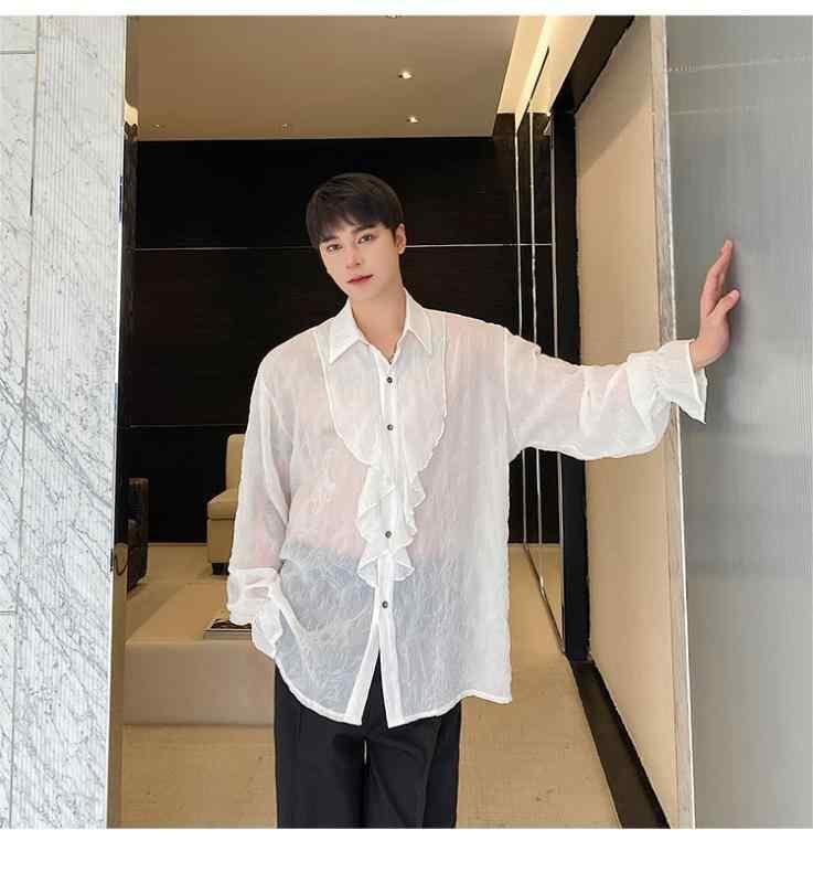 シャツ メンズ シアー 薄手 フリル 襟付き ランタンスリーブ 長袖 UVカット 花柄プリント ゆったり ポリエステル カジュアル 白 黒