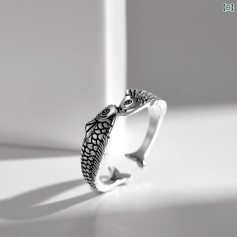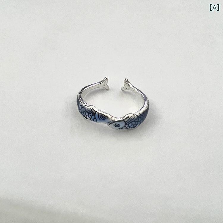 リング レディース エスニック レジン加工 ブルー 双魚 鯉 モチーフ 個性的 デザイン オープンリング 亜鉛合金 レトロ ヴィンテージ 吉祥模様
