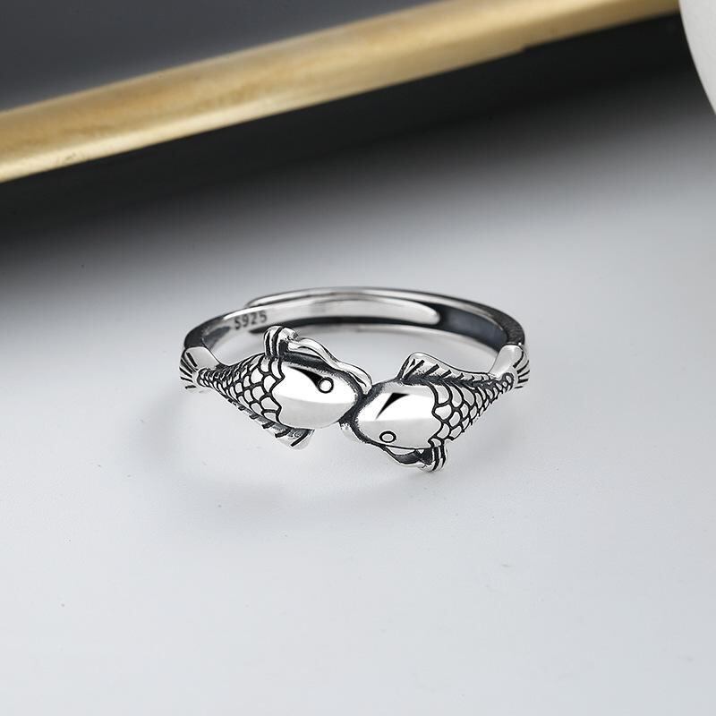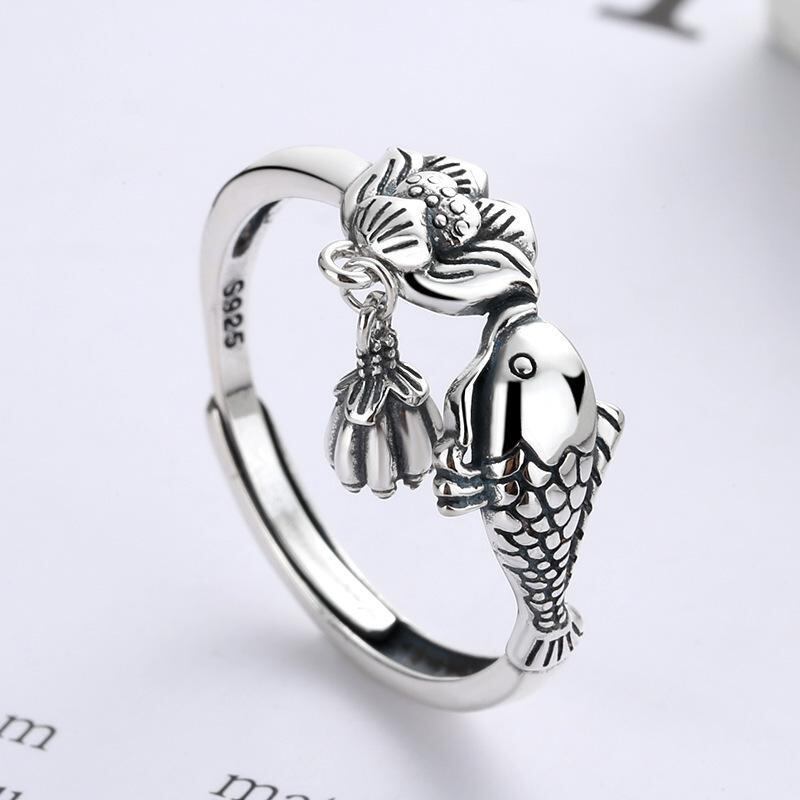 指輪 男女兼用 シルバー 錦鯉 蓮の花 エスニック レトロ調 オープンリング フリーサイズ サイズ調整可能 上品 かわいい カジュアル デイリーユース 幅広いスタイル メッキ加工 金属製