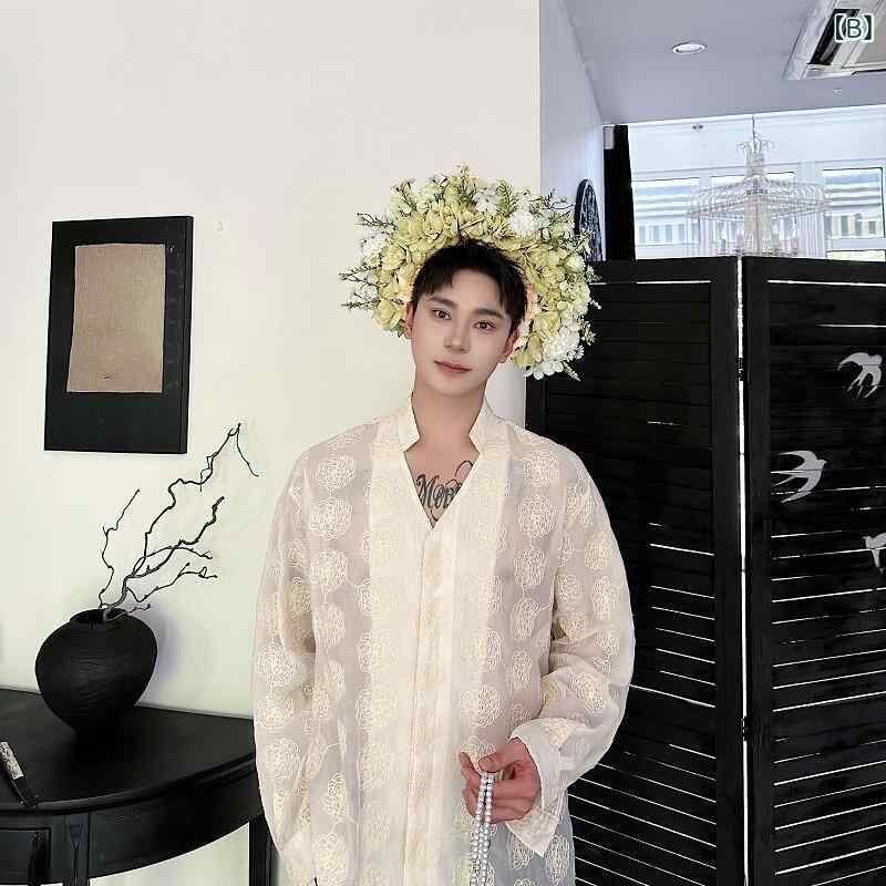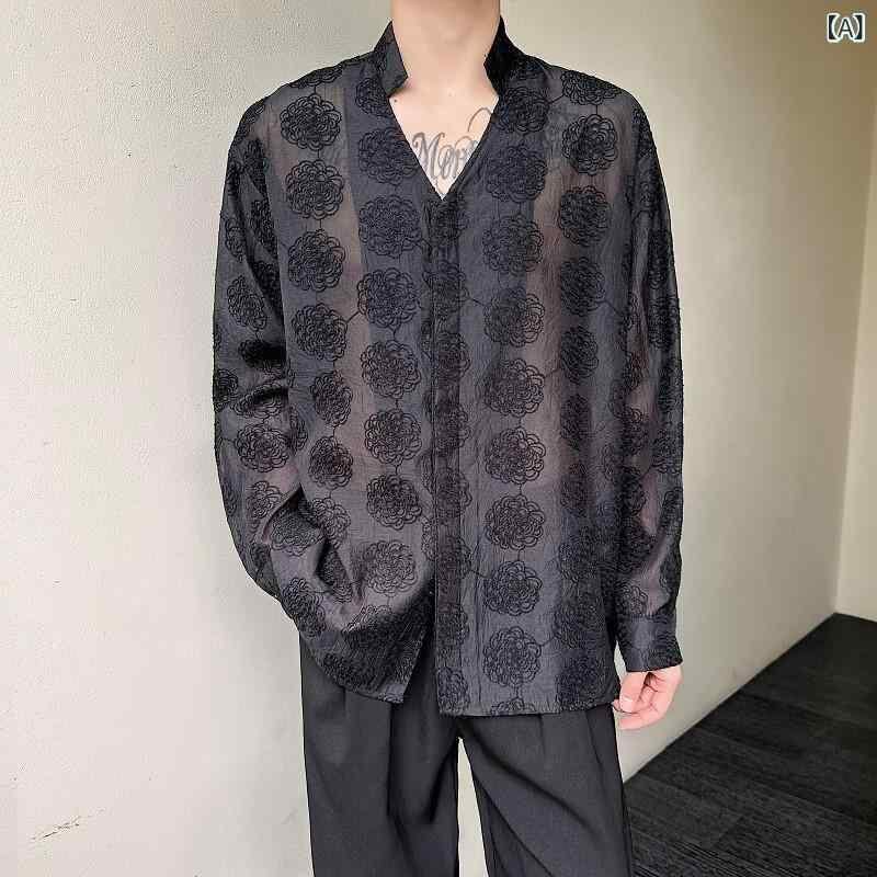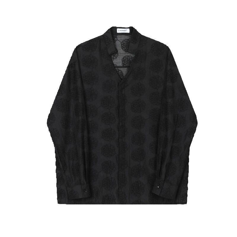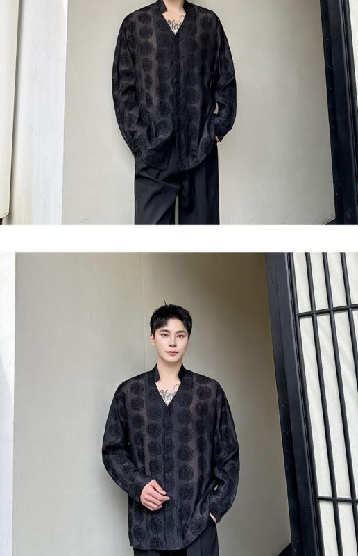 シャツ メンズ Vネック 長袖 薄手 シアー 刺繍 ジャカード シフォン素材 ゆるシルエット UVカット 羽織り ポリエステル 軽量 涼しい 普段使い カジュアル リゾート 旅行 ブラック ベージュ
