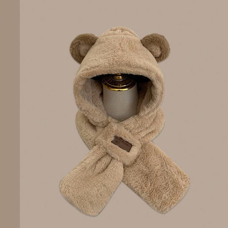 帽子 マフラー レディース クマ耳 ハット フード一体型 耳当て付き もこもこ ふわふわ フェイクファー 防寒 保温 あったか ネックウォーマー 英字デザイン 冬物 アイボリー カーキ ピンク グレーブルー | cybercart