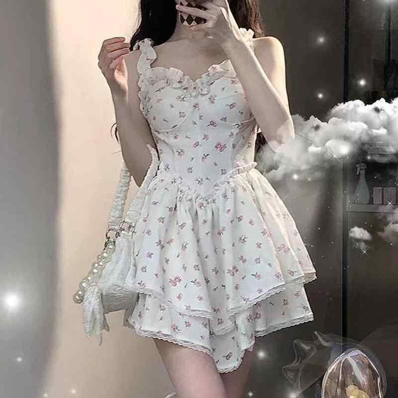 ワンピース レディース フレンチ キャミソール ミディ丈 小花柄 ウエストマーク フェミニン エレガント 上品 かわいい Aライン フレア ポリエステル Uネック ノースリーブ ホワイト 普段使い お出かけ