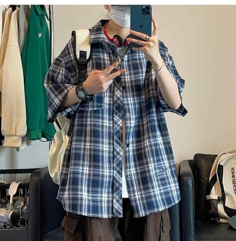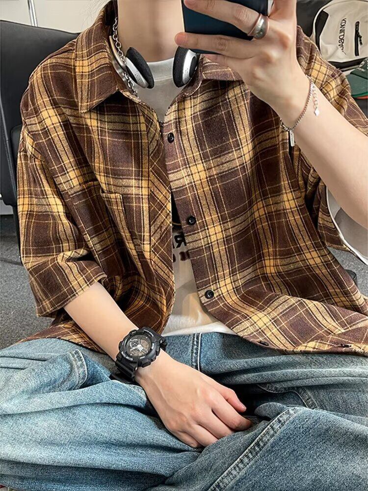 ・カテゴリ: 開襟シャツ・スタイル: 和風レトロ・主な素材: ポリエステル91〜95%・ネックライン: 襟付き・袖丈: 五分袖・柄: チェック・厚み: 普通・フィット: ゆったり・デザイン: ポケット付き・加工: イージーケア・着用シーン: 日常使い・対象年齢層: 成人・対象性別: 男性・カラー展開: ブルー、ブラウン・サイズ展開: M、L、XL、XXL、3XL
