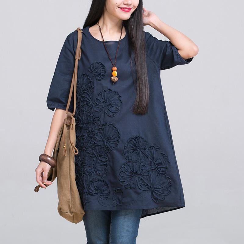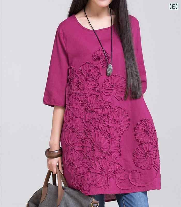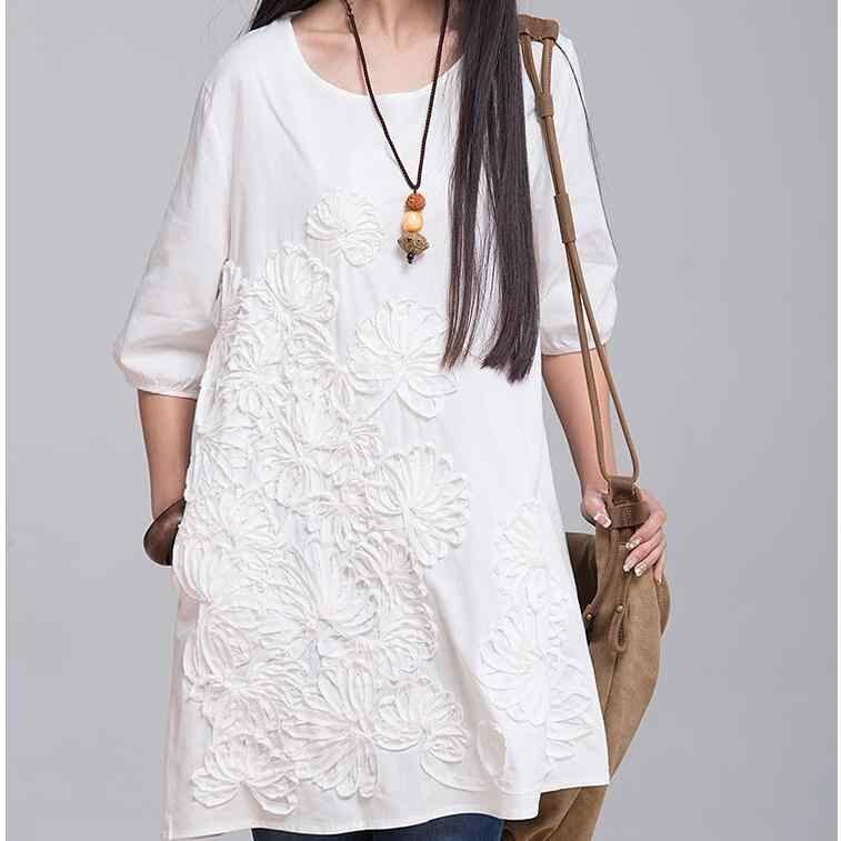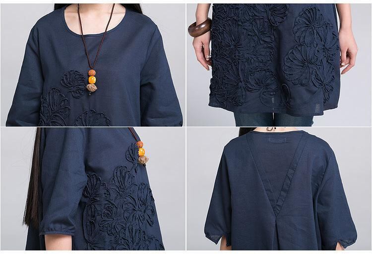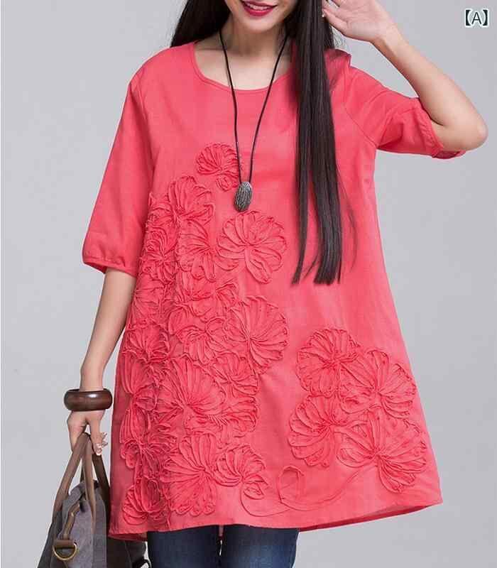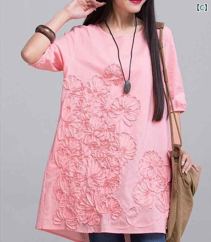 ワンピース レディース 夏 大きいサイズ ゆったり 体型カバー 綿麻 刺繡 花柄 半袖 ラウンドネック リネン コットン混 カジュアル ナチュラル Aライン ミディ丈 ドレス ホワイト ネイビー オレンジ