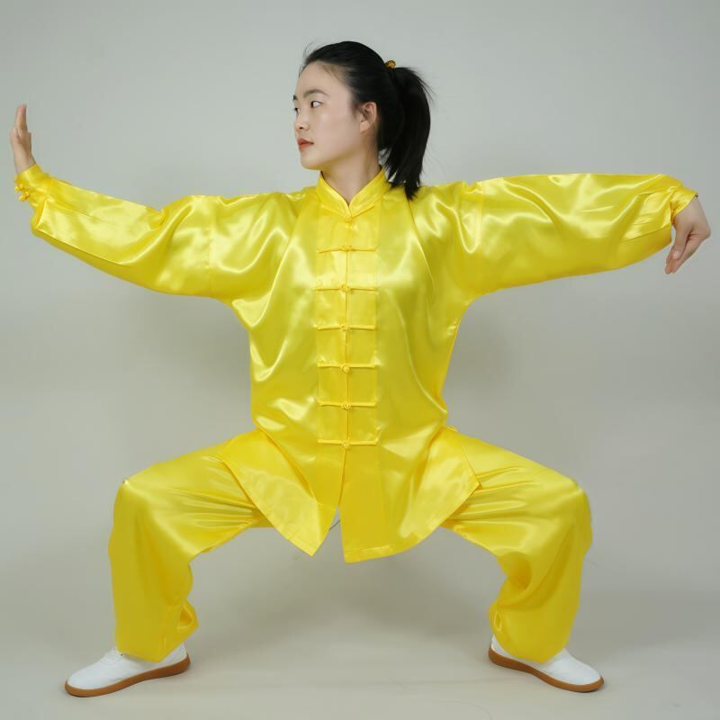 太極服 男女兼用 太極拳ウェア 練習着 演舞服 武術服 朝練 発表会 競技会 訓練服 サテン 光沢 ポリエステル 上下セット セットアップ 白 黄色 赤 黒 青 紫 多色展開 動きやすい 快適