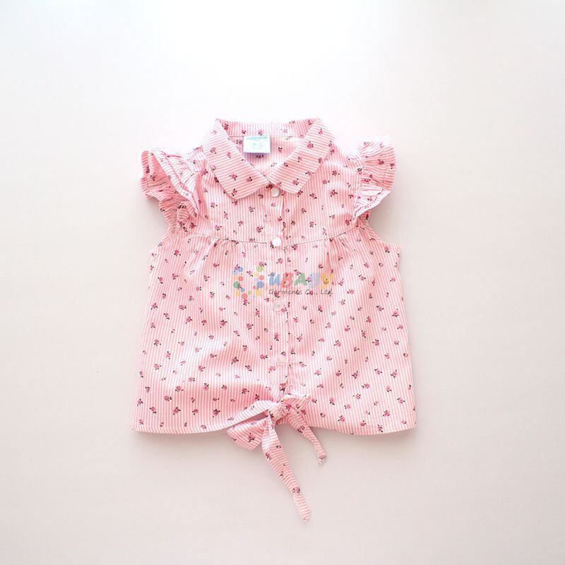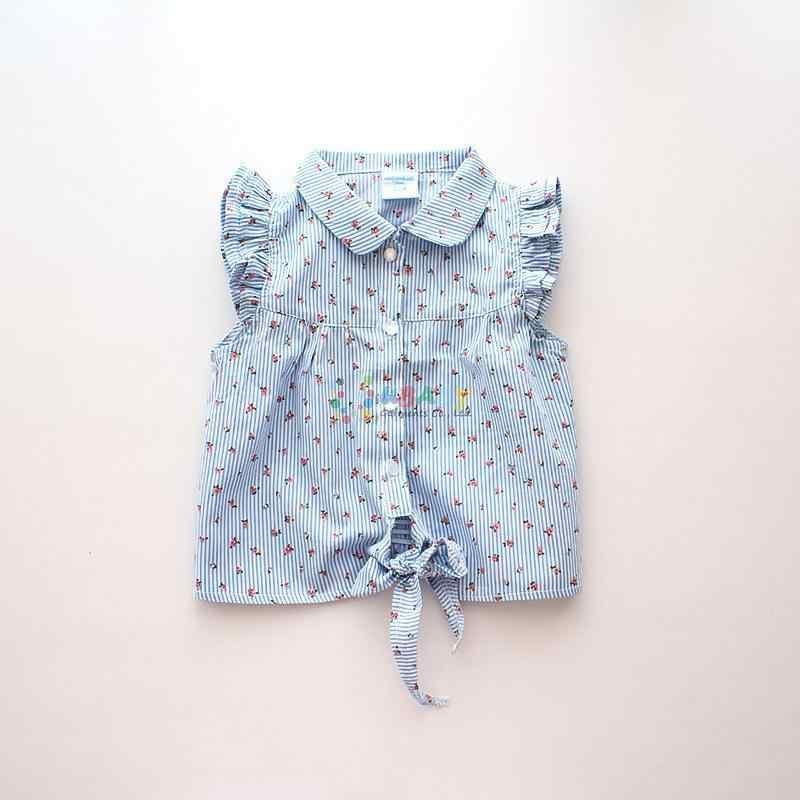 ブラウス キッズ 男女兼用 半袖 フリル袖 小花柄 ストライプ柄 カジュアル トップス 襟付き 綿 コットンブレンド 夏用 ピンク ライトブルー 水色 普段使い