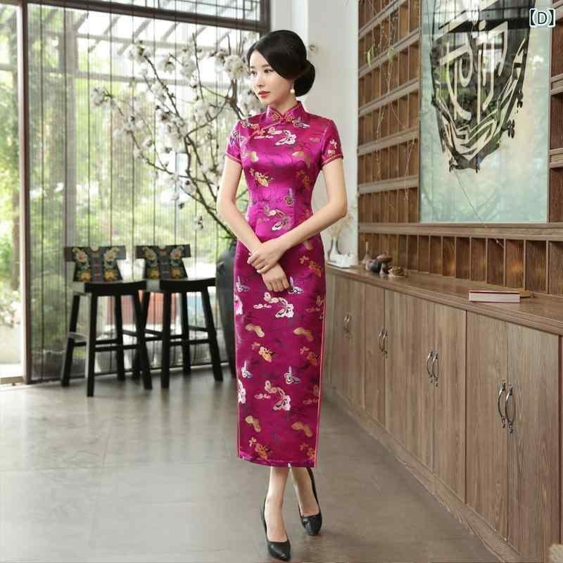 ・生地: 錦織 ・主な素材: アクリル80% ・着丈: ロング丈 ・ネックライン: スタンドカラー ・袖丈: 半袖 ・スリット: ハイタイプ ・カラー展開: パープル、ワインレッド、ブラック、ローズピンク、レッド、スカイブルー ・サイズ展開: S、M、L、XL、XXL、XXXL ・スタイル: エスニック、レトロ ・対象年齢: 成人向け ・対象: 女性