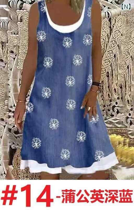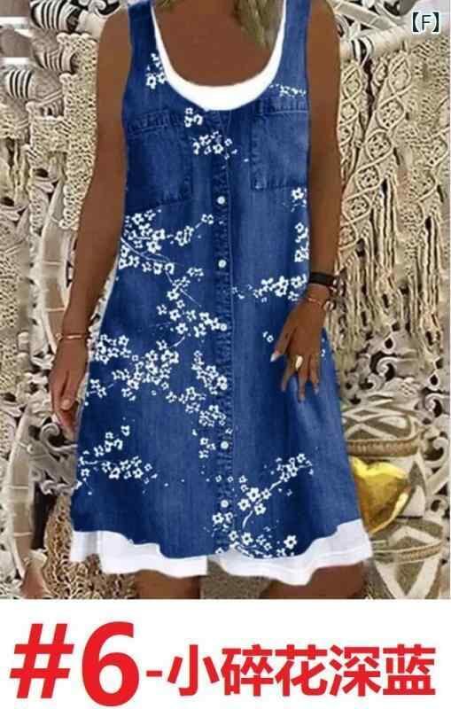 ワンピース レディース ゆったり ルーズフィット デジタルプリント 総柄 花柄 フェイクツーピース 重ね着風 デニム調 ロングワンピース ミモレ丈 Aライン ハイウエスト ポリエステル きれいめ カジュアル 通勤 オフィス 普段使い