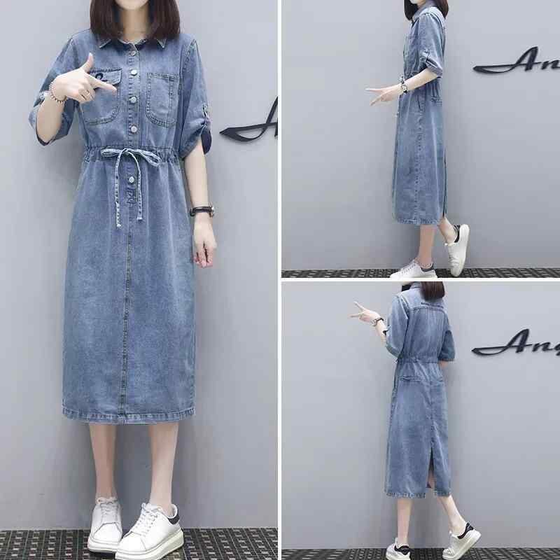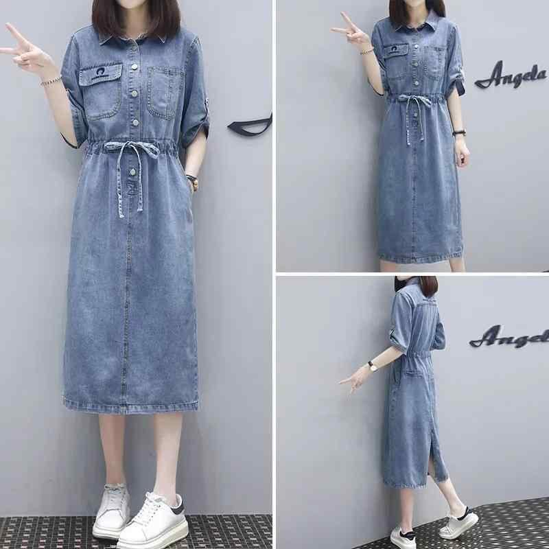 ワンピース レディース デニム 綿 コットン ミディ丈 膝下丈 ウエストマーク Aライン 着痩せ 体型カバー カジュアル デイリー 普段使い 通勤 OL 襟付き 五分袖 半袖 プルオーバー