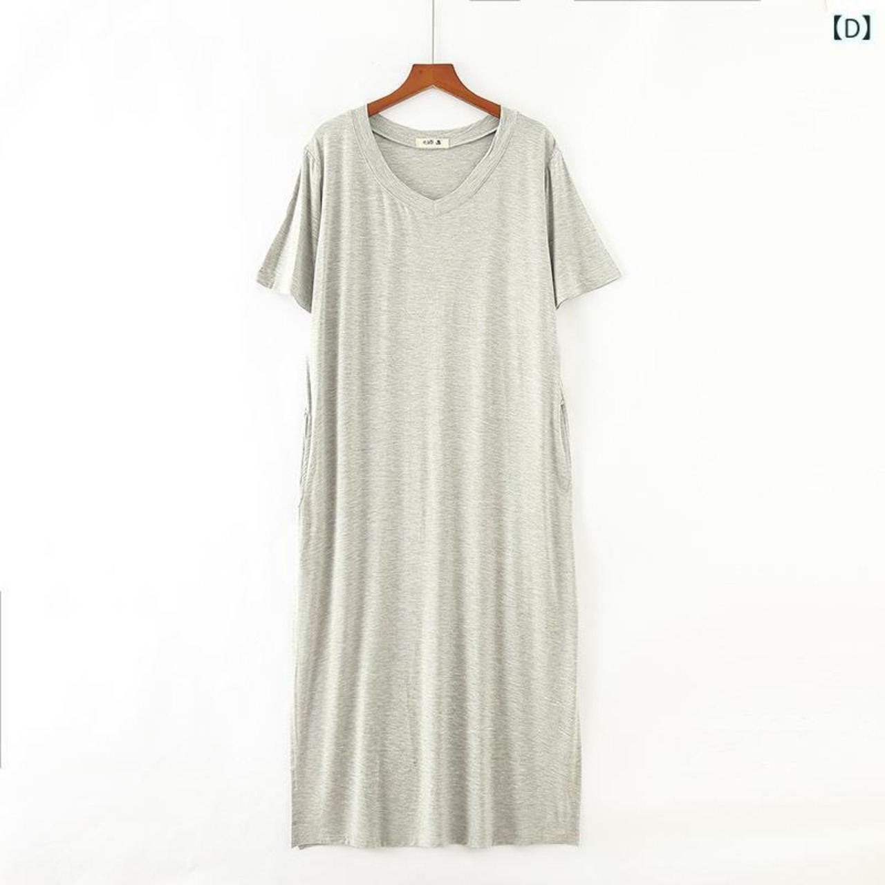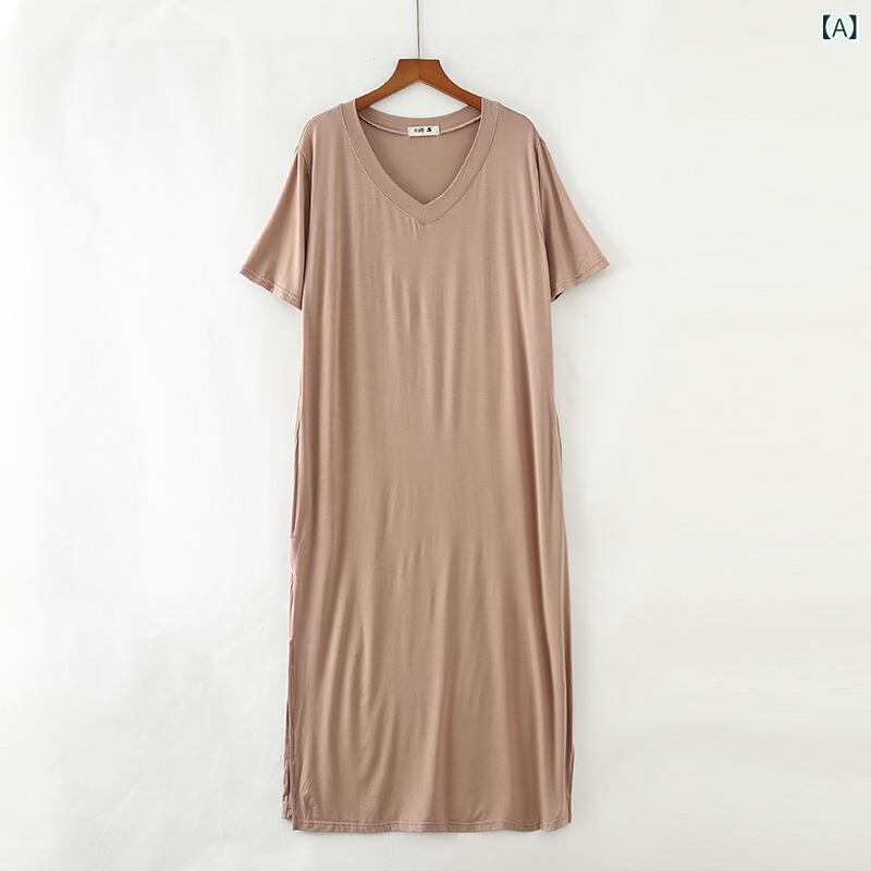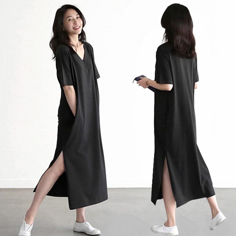 ワンピース レディース 韓国風 Vネック 半袖 モダール ポリウレタン 無地 ゆったり 体型カバー スリット ロング丈 Aライン 快適 リラックス カジュアル 普段使い オールシーズン