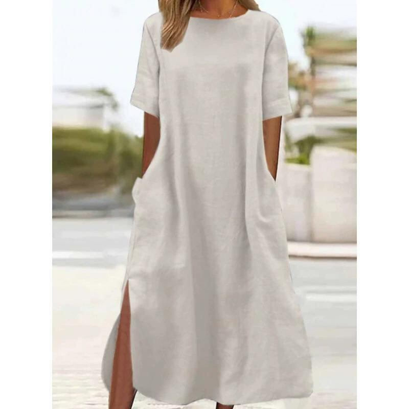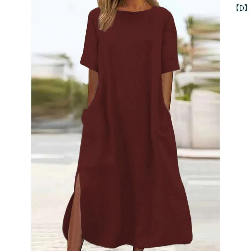 ワンピース レディース 大きいサイズ ロング丈 綿麻 半袖 ラウンドネック カジュアル シンプル ゆったり 通勤 普段使い 上品 エレガント