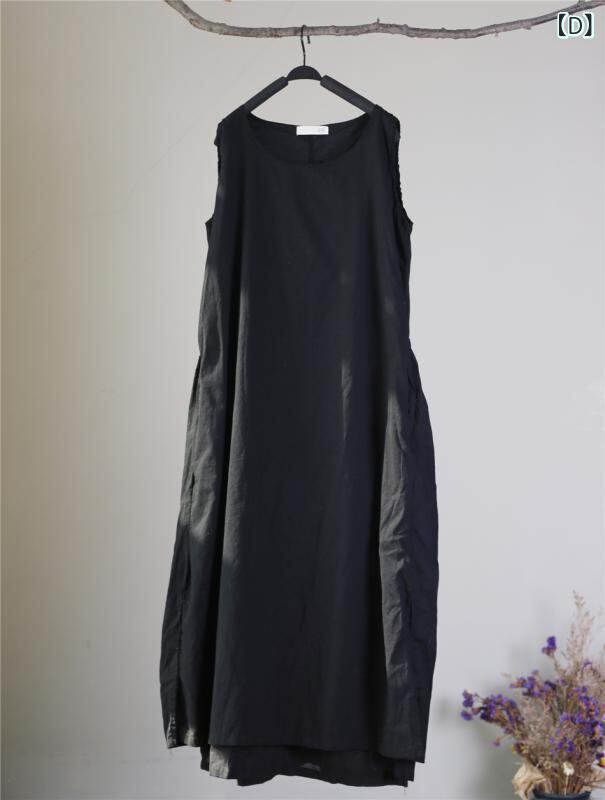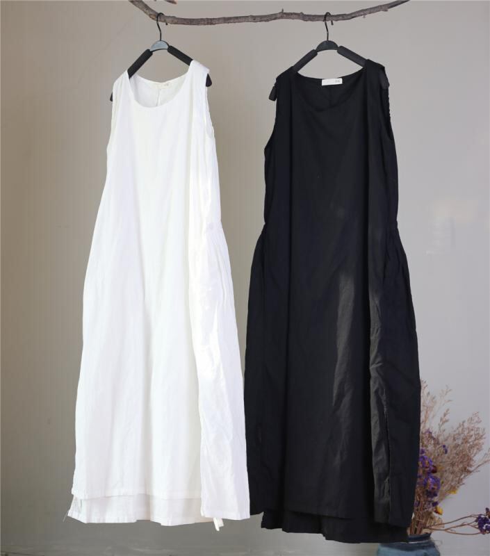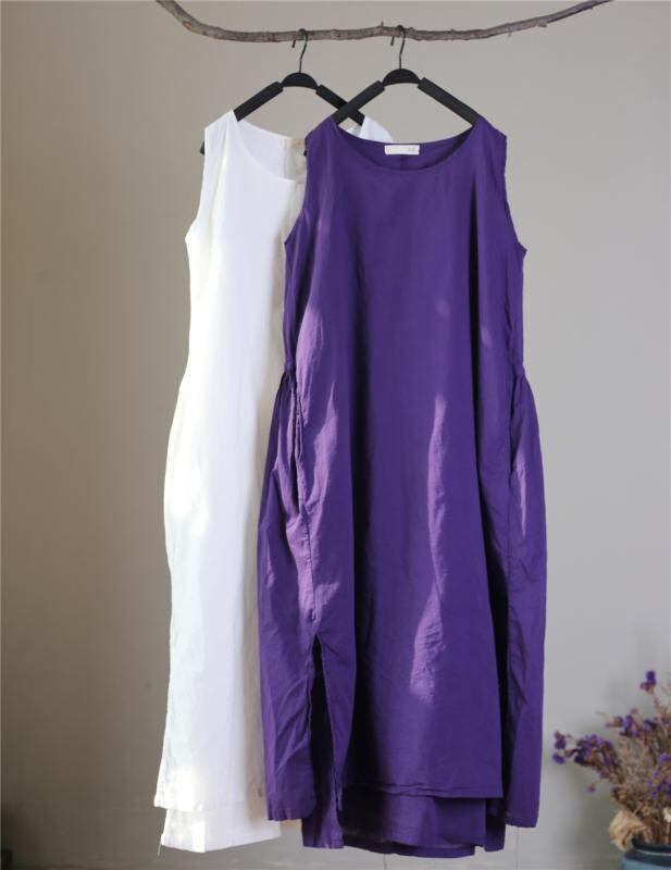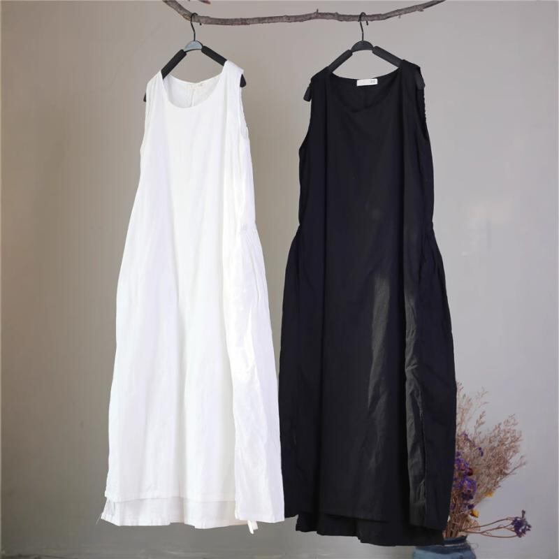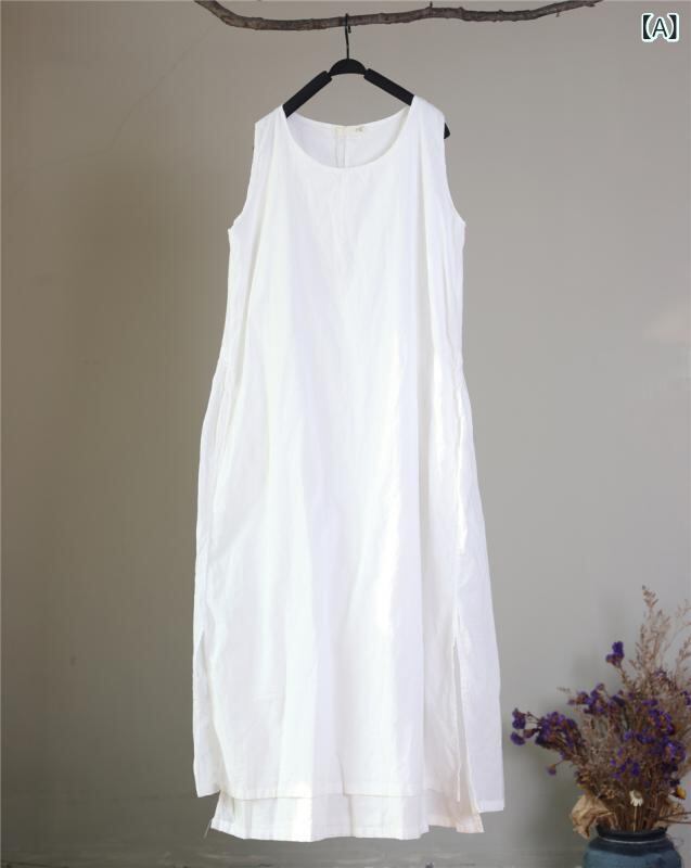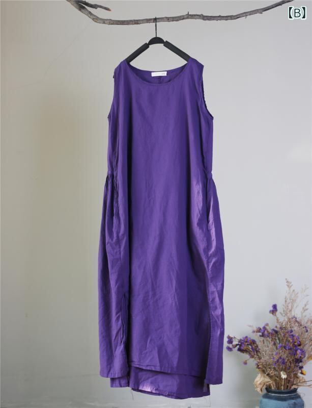 ワンピース レディース 夏物 ノースリーブ クルーネック ゆったり ロング丈 フレア ダブルレイヤー バックウエスト ギャザー ドローストリングリボン 細見え効果 上品 エレガント 綿 麻 無地