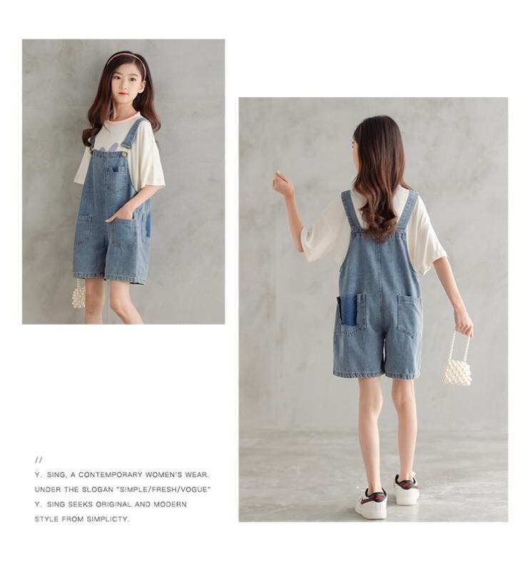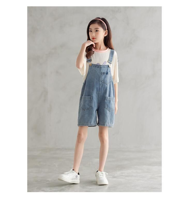 デニム ショートパンツ ガールズ ジュニア 女の子用 韓国風 サロペット オーバーオール 薄手 綿素材 ハイウエスト ブルー かわいい 親子コーデ カジュアル 通学 普段使い