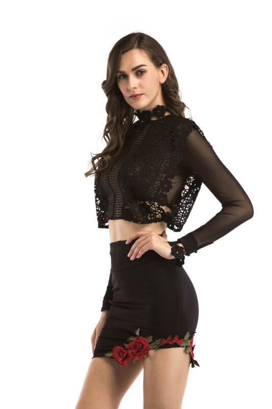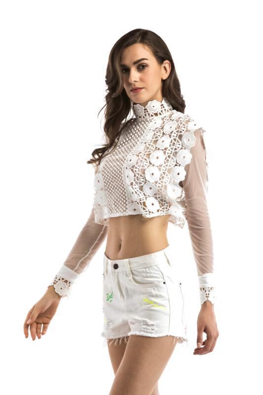レースブラウス レディース 透かし編み シースルー スタンドカラー セクシー 細見え 長袖 前開き ショート丈 ゆったり 切り替えデザイン ポリエステル 無地 ホワイト ブラック アーバンカジュアル