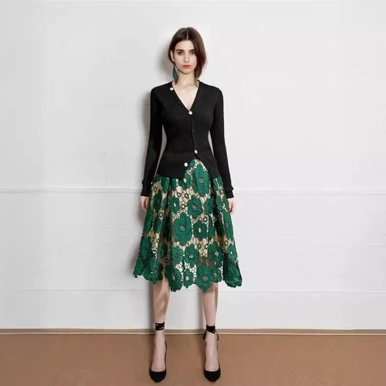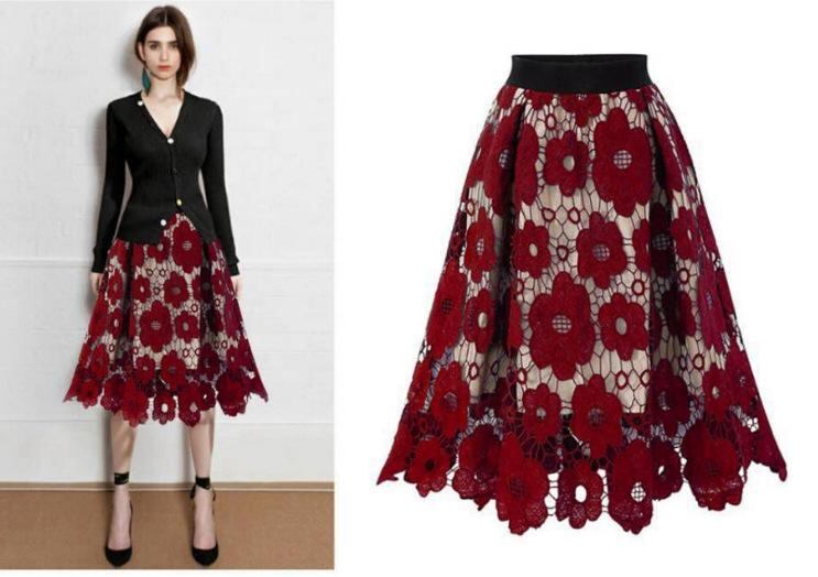 半身スカート レディース Aライン 高ウエスト レース ミモレ丈 無地 フレア 大きいサイズ ゆったり エレガント きれいめ オフィス 通勤スタイル 伸縮性 ポリエステル