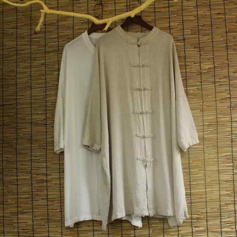 シャツ ブラウス レディース チャイナ風 レトロ スタンドカラー 飾りボタン ゆったり ルーズ ビッグシルエット 綿麻 リネン ミドル丈 チュニック丈 ドルマンスリーブ 長袖 無地 ナチュラル 羽織り カジュアル