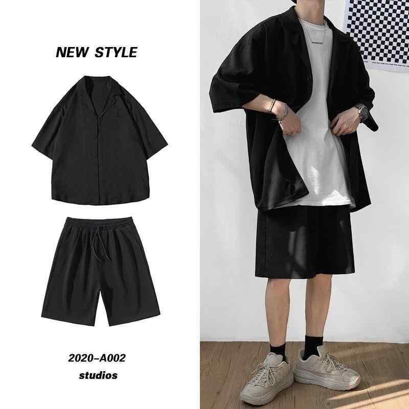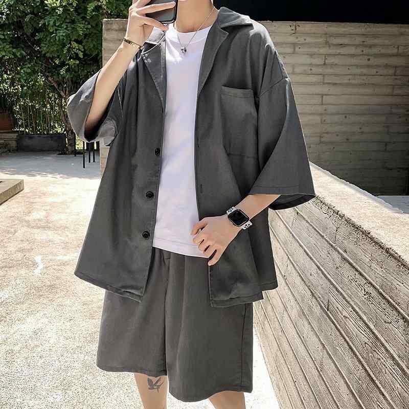 セットアップ メンズ 夏 カジュアル 七分袖 シャツジャケット 五分丈 ハーフパンツ ゆったり ルーズフィット ビッグシルエット 上下セット アセテート ポリエステル素材 通気性 吸湿速乾 涼しい 普段使い リラックスウェア ブラック グレー