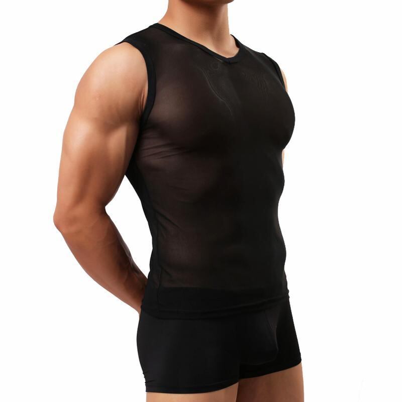 タンクトップ メンズ 男性用 メッシュ シースルー ノースリーブ ラウンドネック タイトフィット ナイロン 薄手 通気性 インナー セクシー ルームウェア ナイトウェア スポーツ 部屋着 オールシーズン対応 ホワイト ブラック