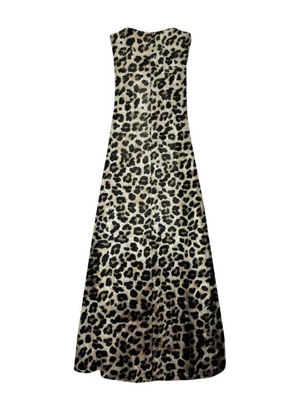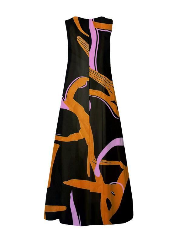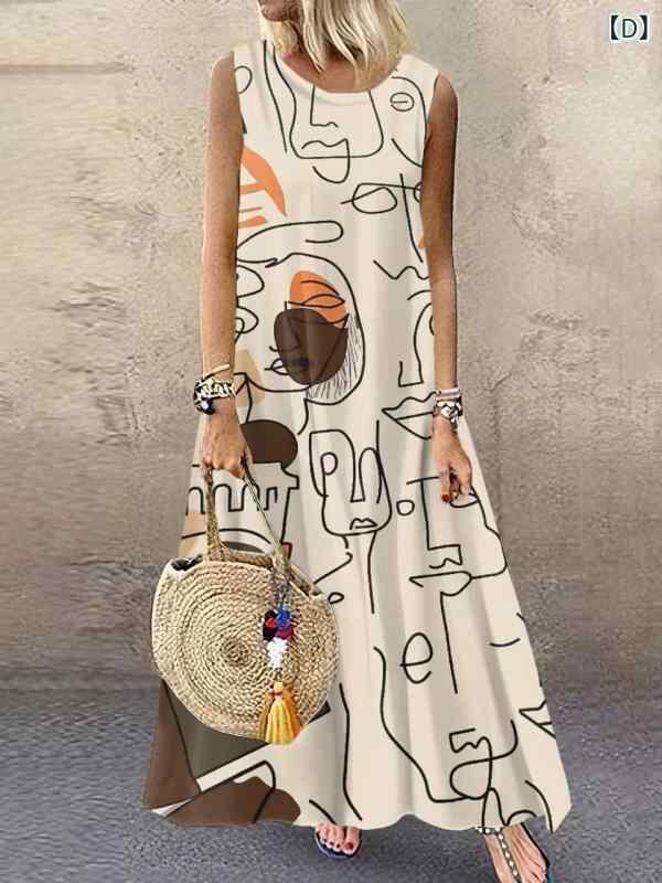 ワンピース レディース ラウンドネック プリント ノースリーブ ロング丈 大きいサイズ ゆったり Aライン ミモレ丈 ポリエステル素材 通勤 オフィス 普段使い 体型カバー エレガント カジュアルスタイル