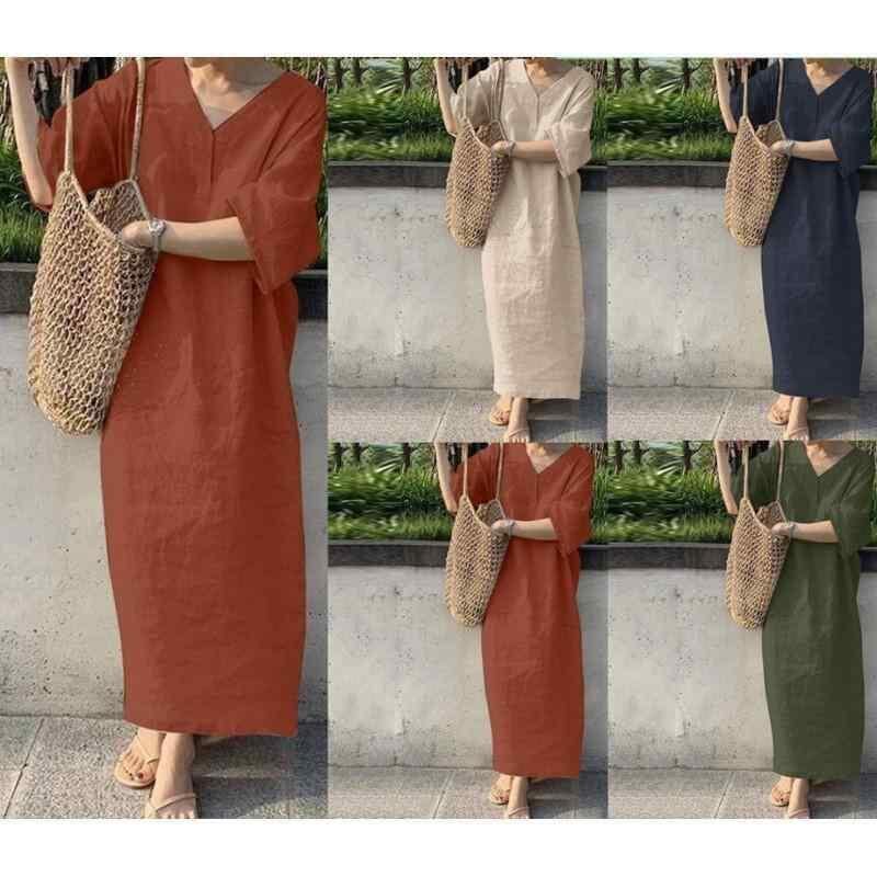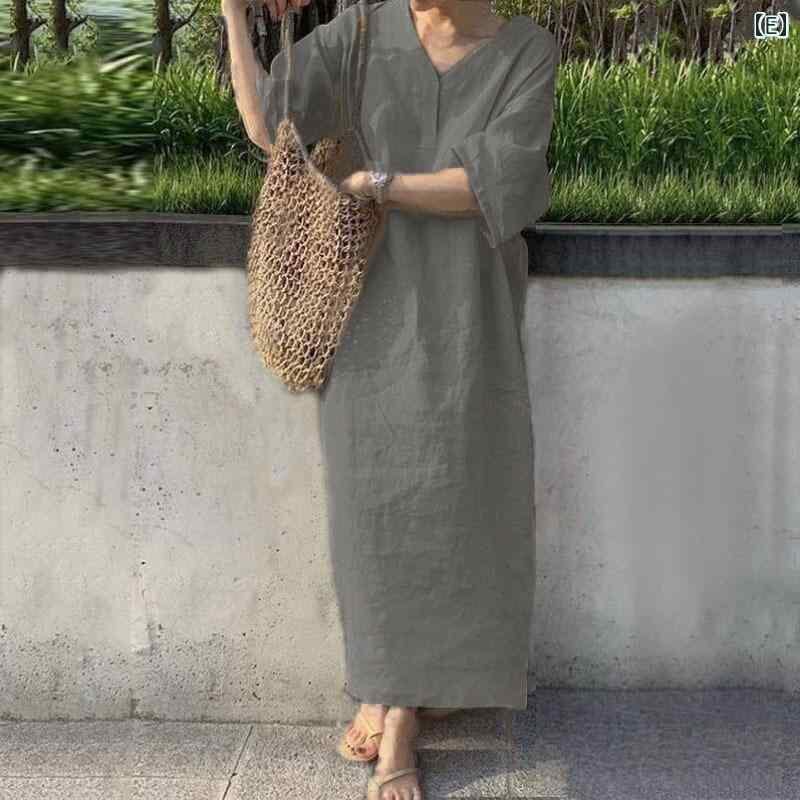 ・カテゴリ: ワンピース ・スタイル: エレガントカジュアル ・主な素材: 綿麻 ・素材(一部): アクリル30~50% ・素材(その他): ポリエステル10%以下 ・ネックライン: Vネック ・袖丈: 半袖 ・袖タイプ: レギュラー ・スカート丈: ロング丈 ・スカートシルエット: ベル型 ・ウエストタイプ: ミドルウエスト ・フロント: プルオーバー ・柄: 無地 ・加工: パッチワーク、切り替え ・デザイン要素: プリーツ ・セット内容: 単品 ・カラー展開: オレンジレッド、ライトカーキ、グリーン、ダークブルー、グレー ・サイズ展開: S、M、L、XL、XXL、3XL、4XL、5XL