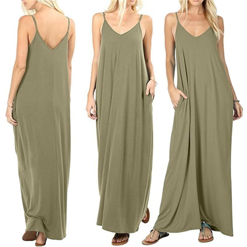 ワンピース レディース 無地 ゆったり Vネック ロング丈 キャミソール ドレス 体型カバー Aライン フレア ポケット付き 綿混 コットン ポリエステル混 ノースリーブ 通勤 リラックス カジュアル 上品 エレガントスタイル