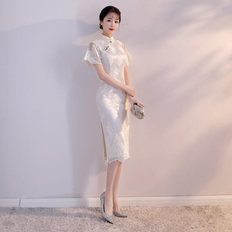 旗袍 レディース レース 改良デザイン 上品 エレガント おしゃれ 清楚 フェミニン ロング丈 スタンドカラー 七分袖 パフスリーブ 斜め襟 ロースリット ビーズ飾り ポリエステル 綿