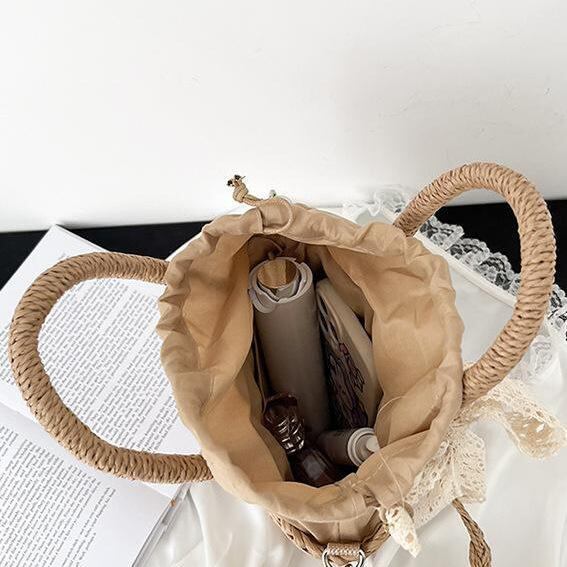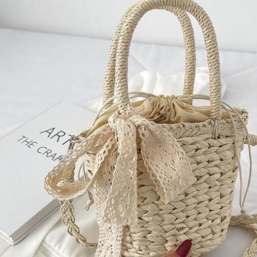 バッグ レディース ストロー 麦わら 草編み バケットバッグ バケツ型 ショルダーバッグ 斜め掛け 手提げ ハンドバッグ 3WAY 巾着開閉 レース 花柄 フローラル 織り込み 携帯ポケット付き 個性的 ファッション デイリー 普段使い お出かけ