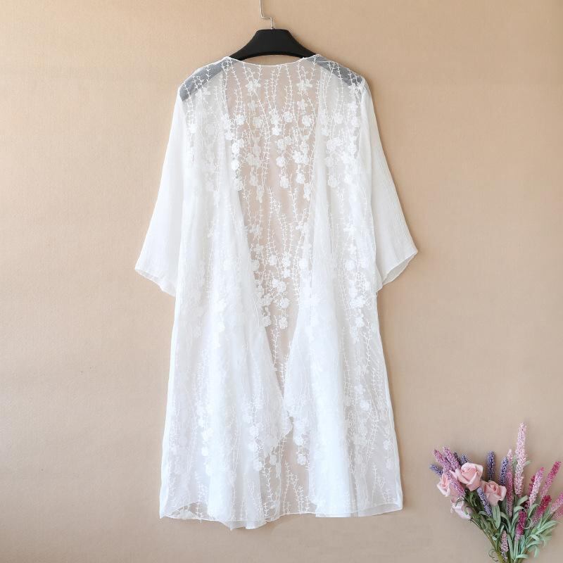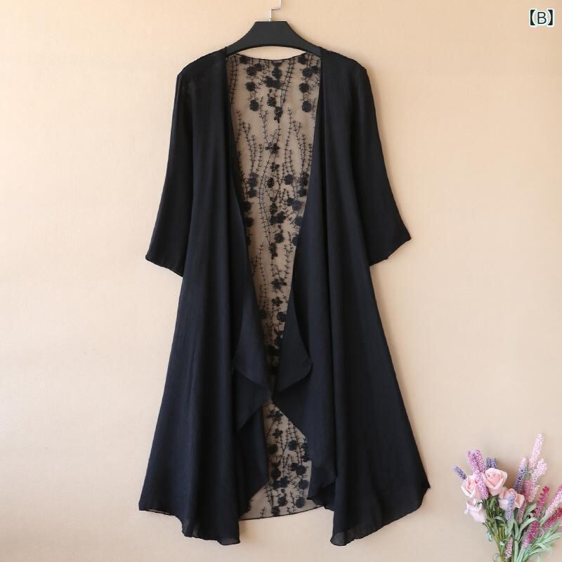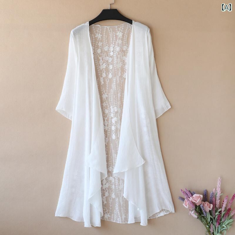 カーディガン レディース 女性用 メッシュ レース 透かし編み かぎ編み 接触冷感 ゆったり UV対策 薄手 シアー ミドル丈 羽織り 冷房対策 大きいサイズ 体型カバー 春 夏 無地 ポリエステル 通勤 オフィス カジュアル 白 黒