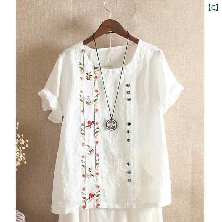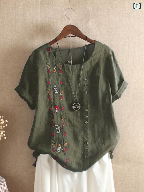 Tシャツ レディース 韓国風 おしゃれ 刺繍 半袖 綿麻 ゆったり オーバーサイズ クルーネック 丸首 トップス カジュアル ファッション 紫 イエロー ホワイト 紺 カーキ ダークグリーン