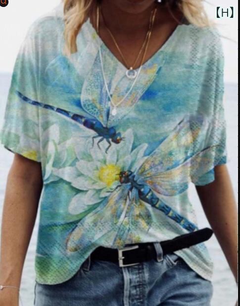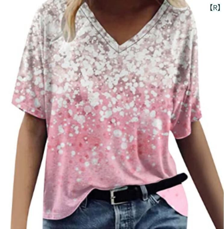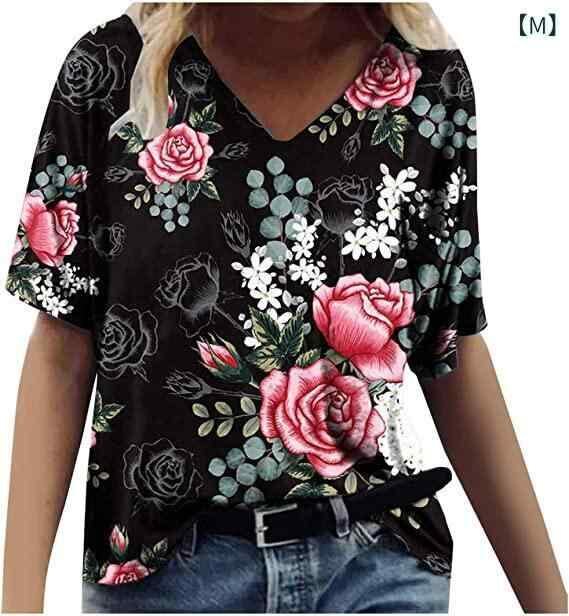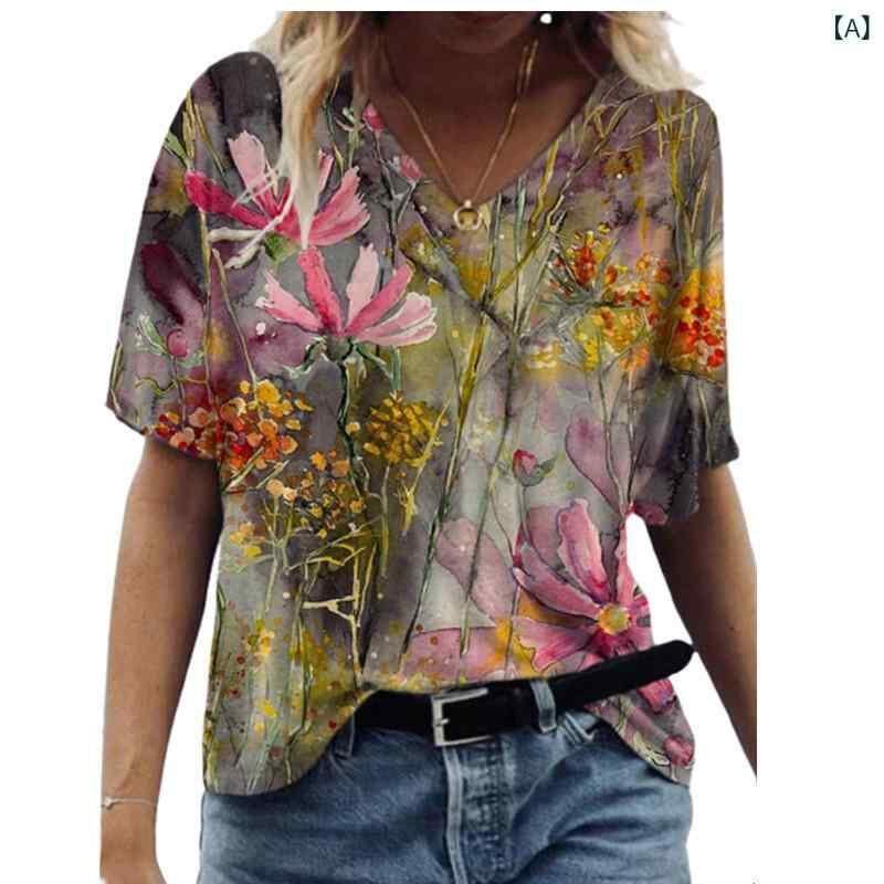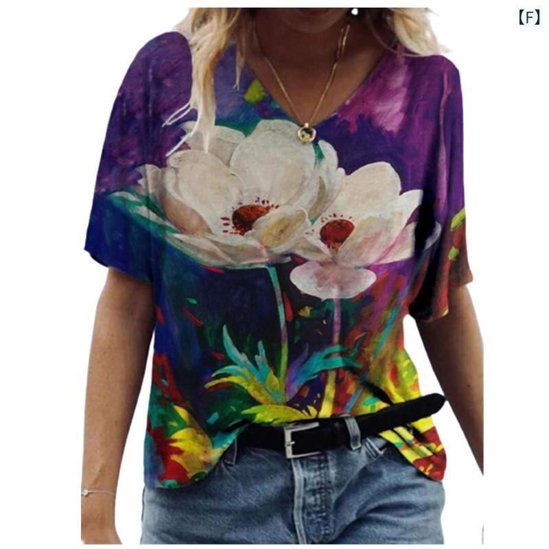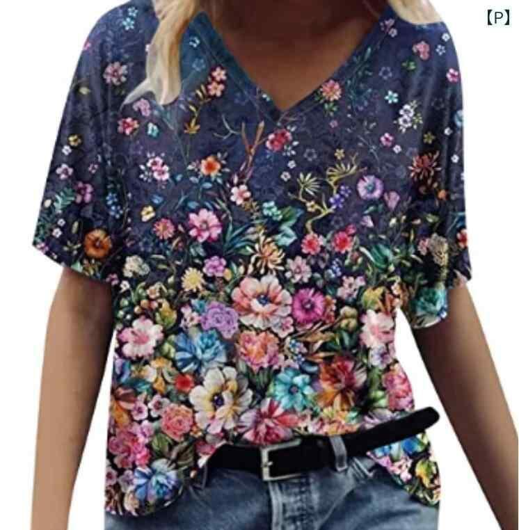 Tシャツ レディース Vネック 半袖 花柄 油絵風 プリント 再生繊維 ポリエステル ストレートシルエット 欧米風 ストリート トレンド リラックス カジュアル 普段使い
