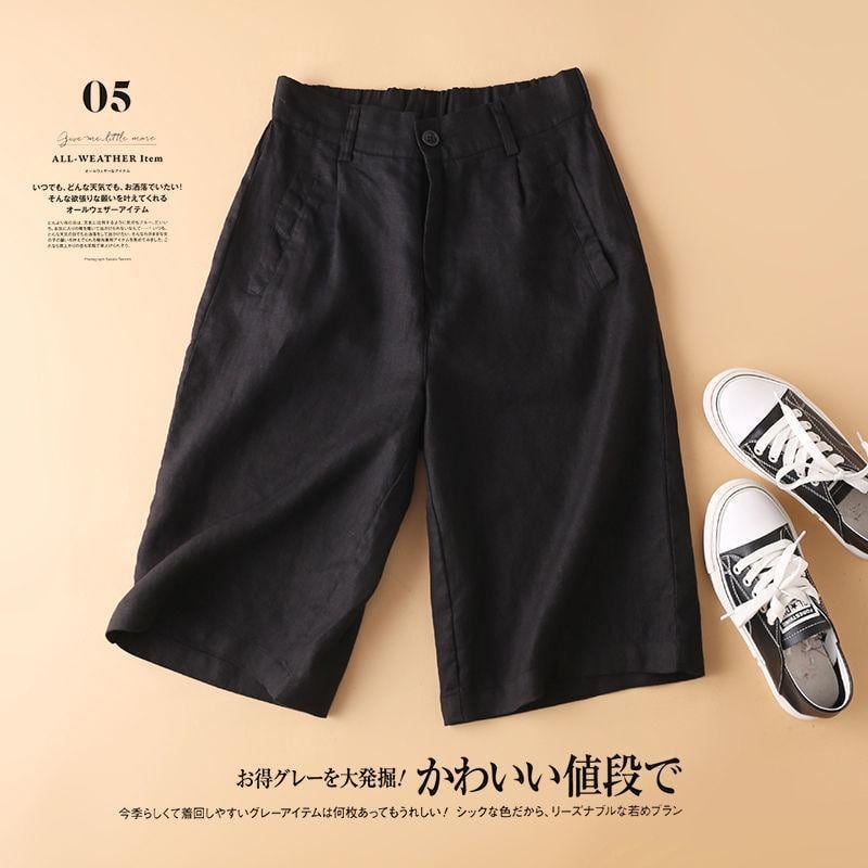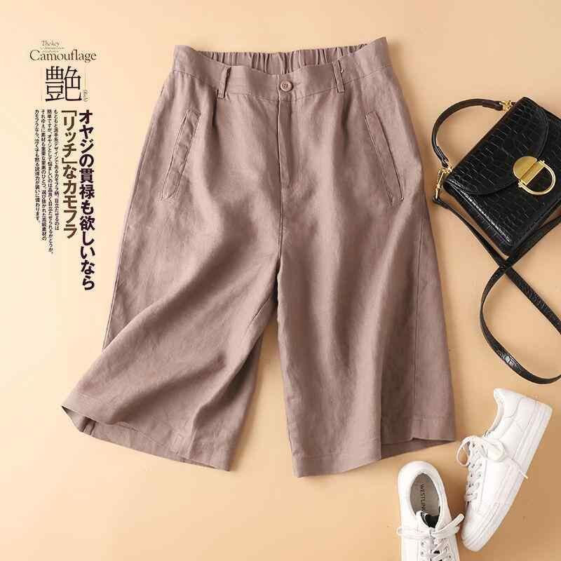 パンツ レディース ワイドパンツ 五分丈 ハーフパンツ ハイウエスト ウエストゴム ルーズフィット ゆったり 体型カバー 綿麻 コットンリネン ビスコース 薄手 ナチュラル カジュアル リラックス 夏 ブラック ベージュ カーキ